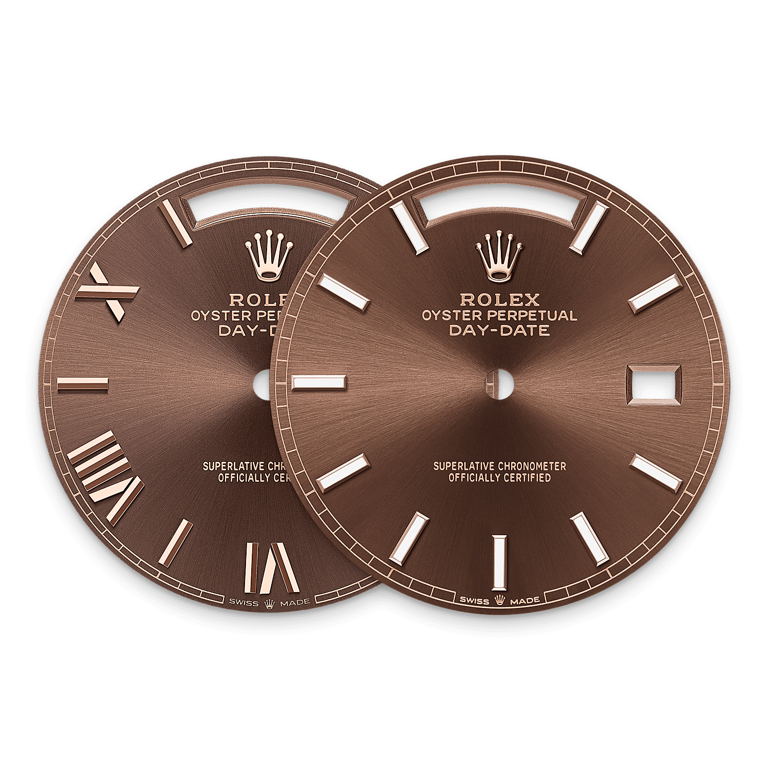 18K永恒玫瑰金款采用新颖的渐变石板灰色表盘,使中央着色部分与边缘深黑色之间呈现细腻的过渡。同时,星期日历型 40的渐变色表盘亦首次点缀18K粉红金钟点标记以及组合刻面罗马数字。