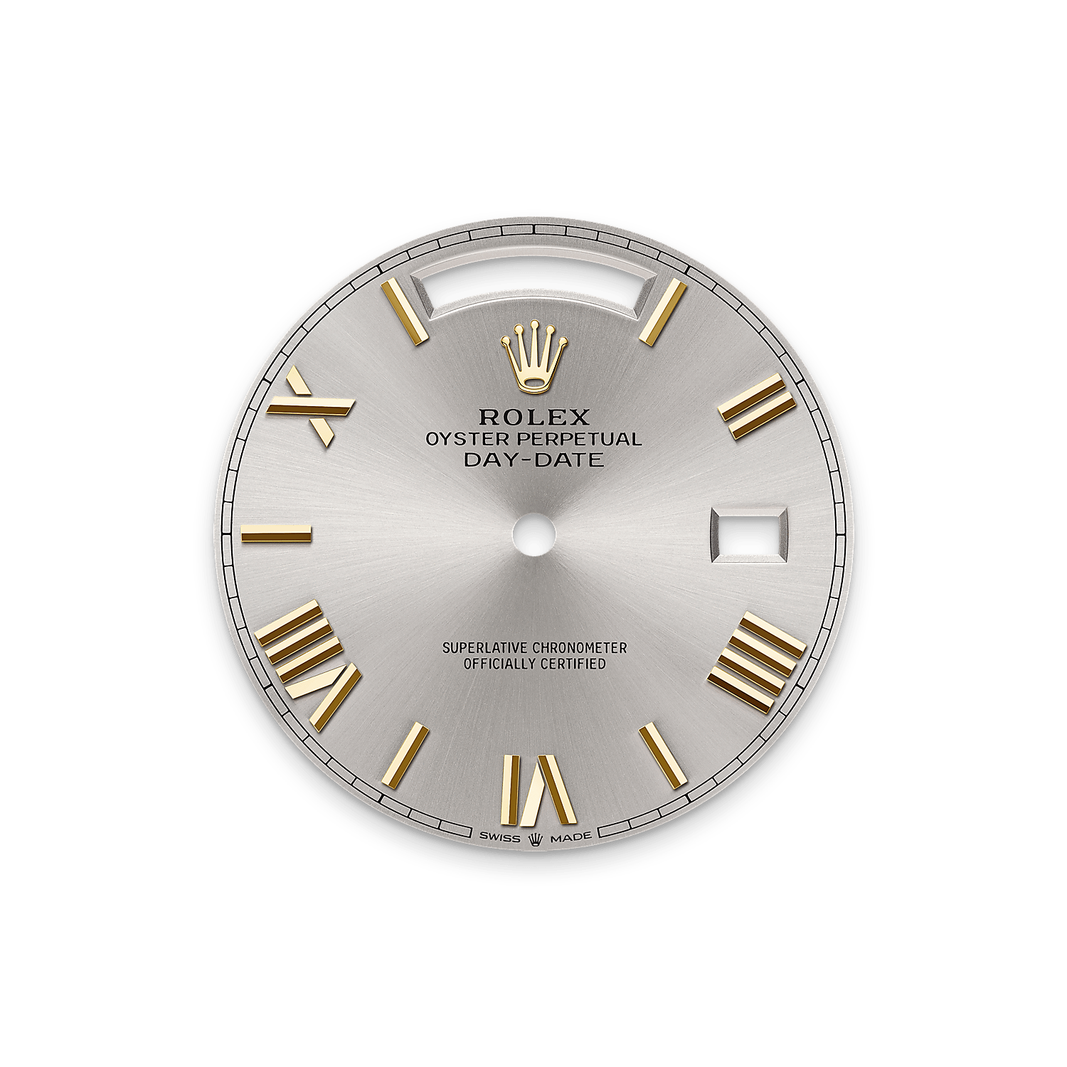 蚝式恒动星期日历型 40腕表18K黄金款,搭配银色表盘、镶钻外圈及元首型(President)表带。