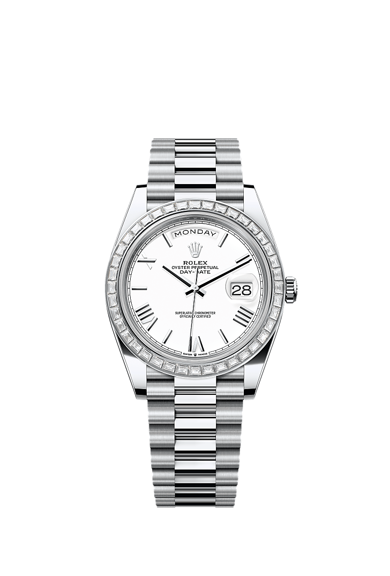 蚝式恒动星期日历型 40腕表铂金款,搭配白色表盘、镶钻外圈及元首型(President)表带。