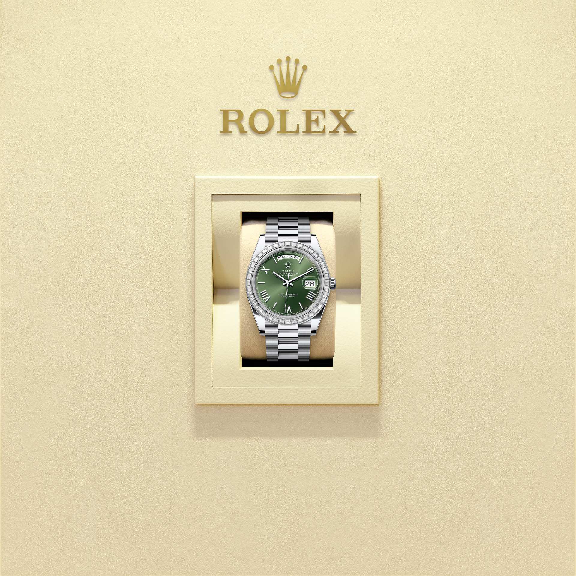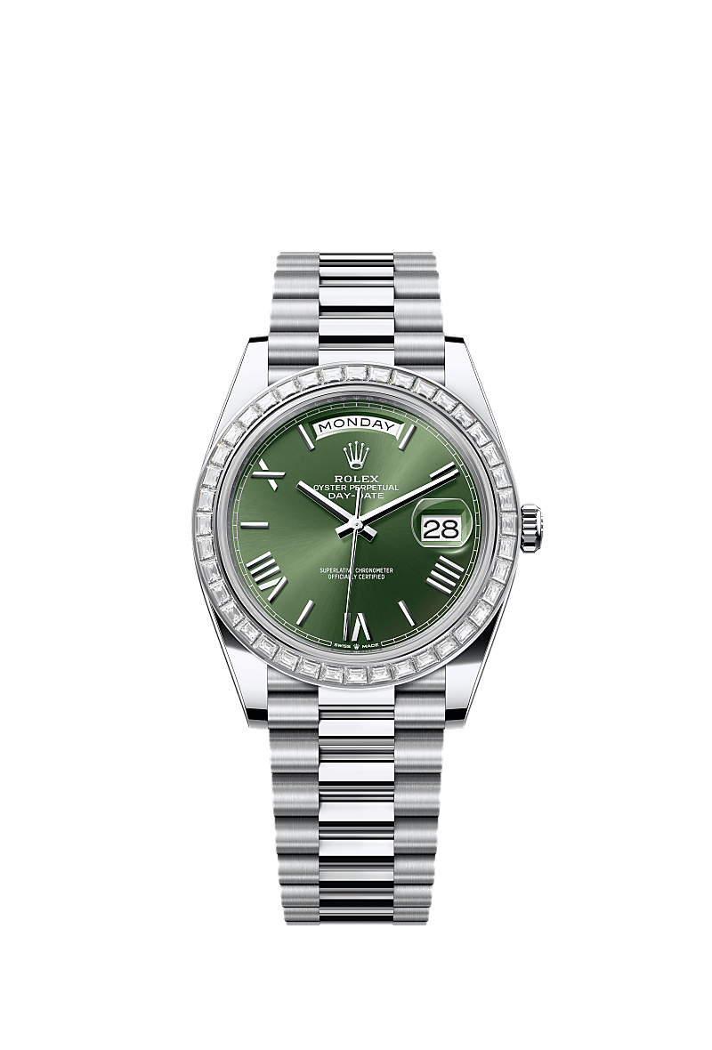 蚝式恒动星期日历型 40腕表铂金款,搭配橄榄绿色表盘、镶钻外圈及元首型(President)表带。