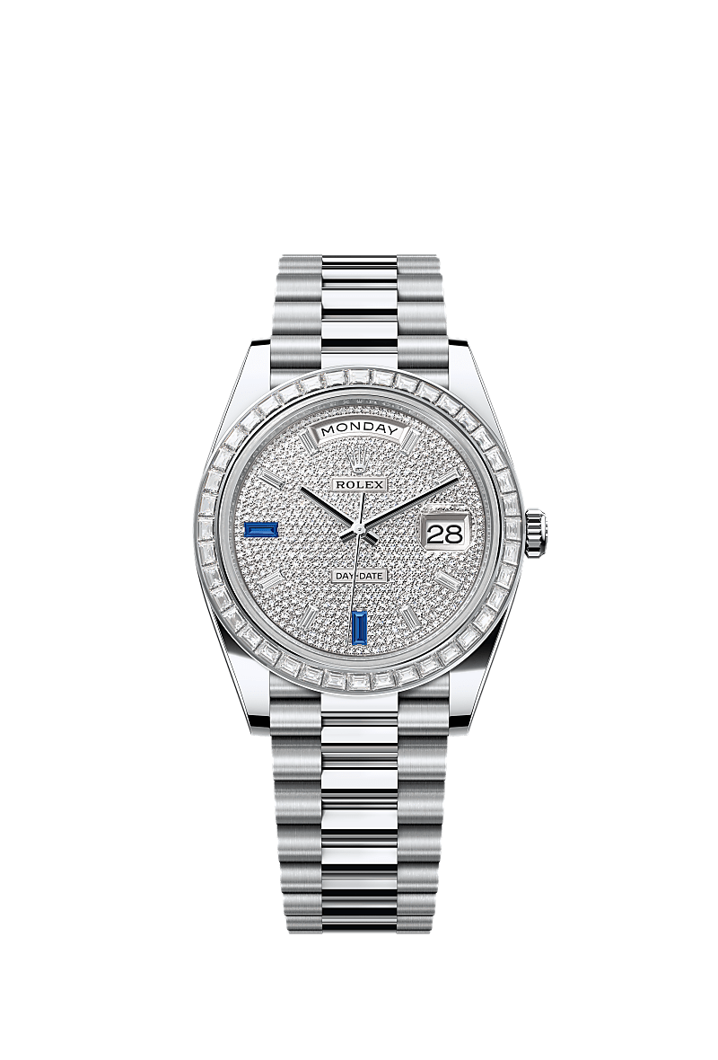 蚝式恒动星期日历型 40腕表铂金款,搭配密镶钻石表盘、镶钻外圈及元首型(President)表带。