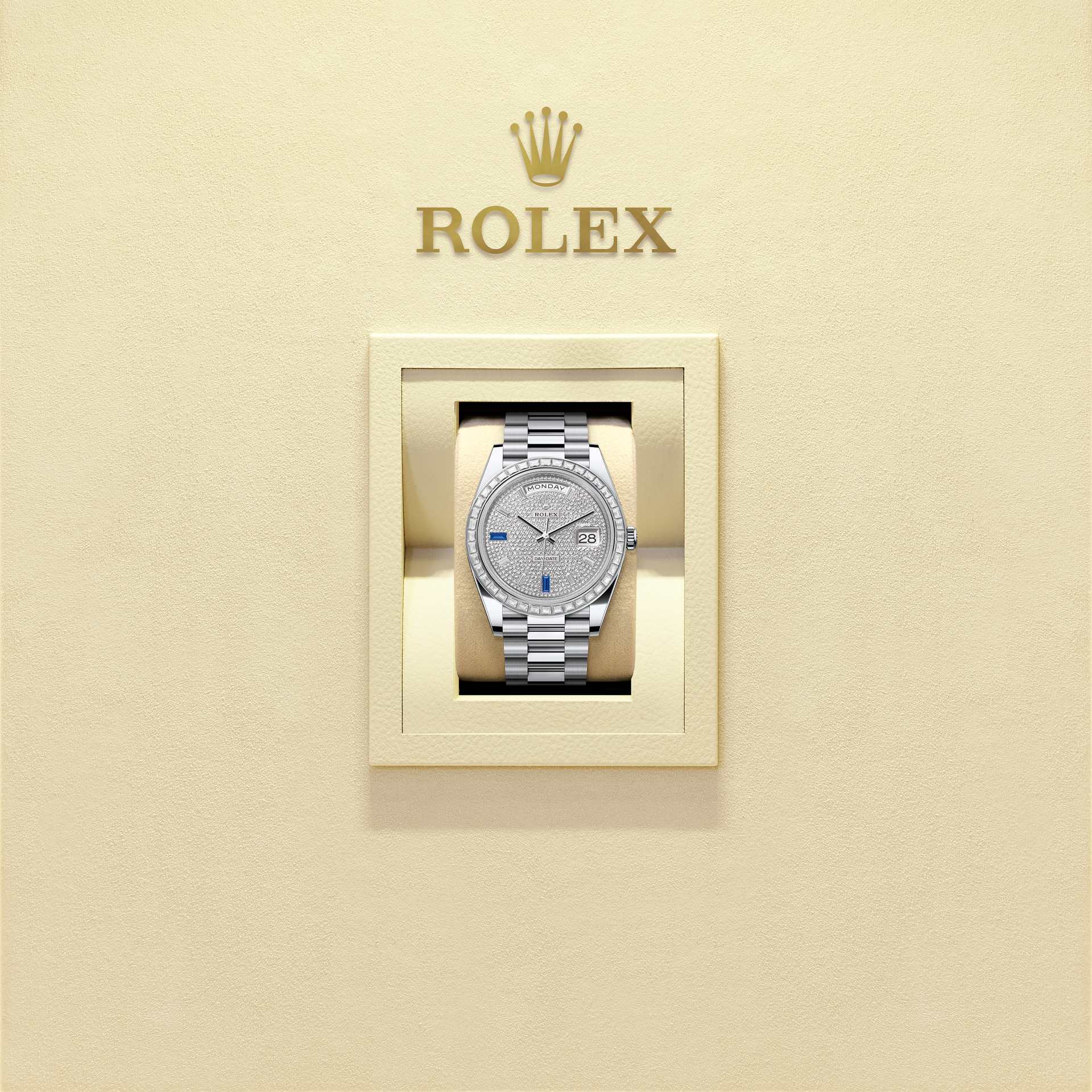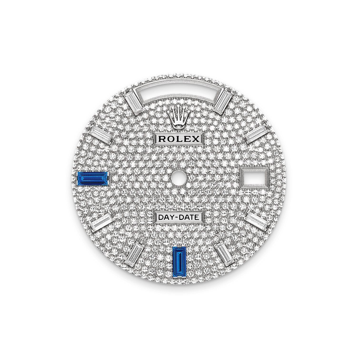 表盘设有8颗方形钻石,6及9点钟位置镶方形蓝宝石。劳力士精心挑选珍罕尊贵的钻石、蓝宝石、红宝石、绿宝石,为腕表增添华美光彩。劳力士内部掌握宝石镶嵌的专业技术和精密设备,因此腕表的镶嵌工作均在内部进行。