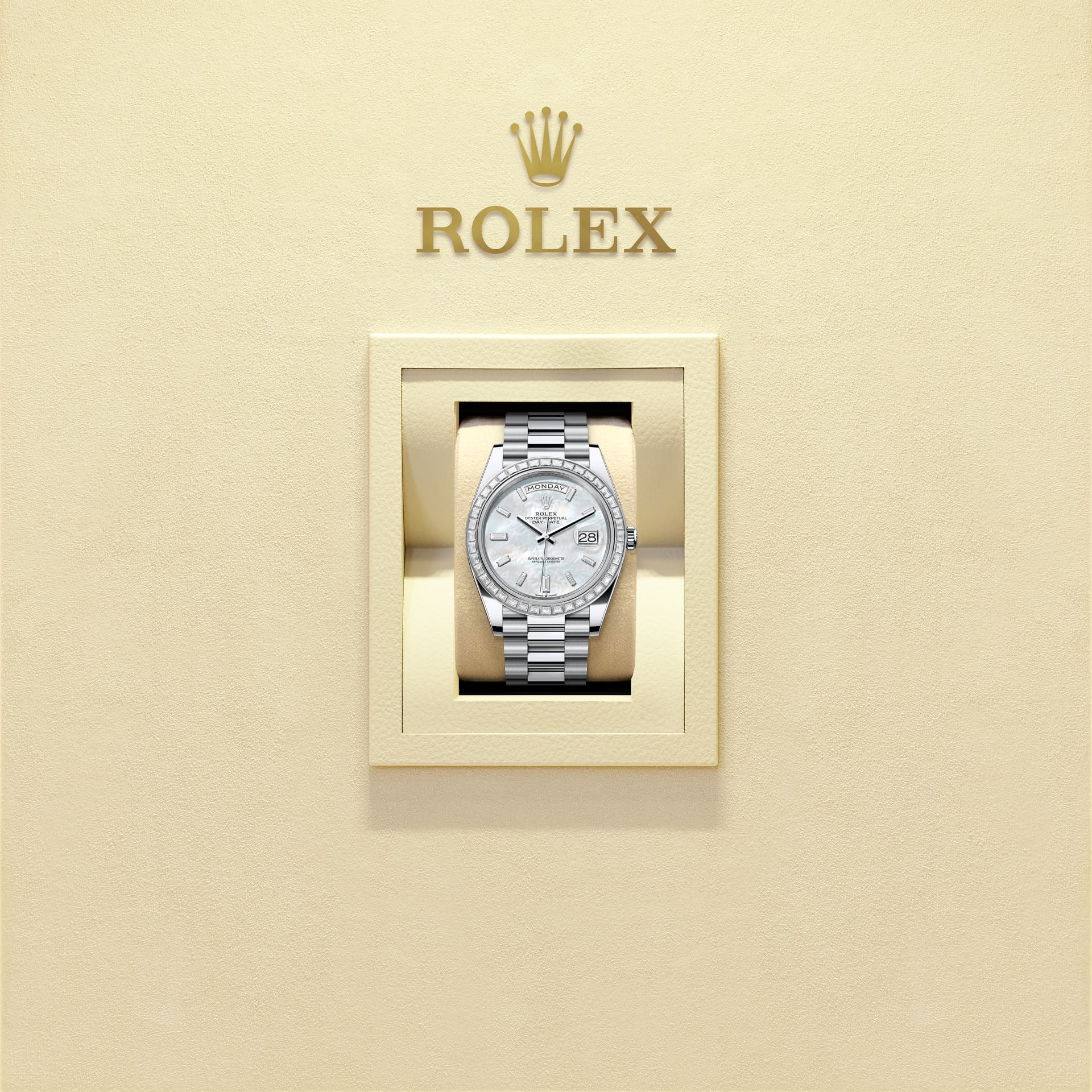 蚝式恒动星期日历型 40腕表铂金款,搭配镶钻白色珍珠母表盘、镶钻外圈及元首型(President)表带。