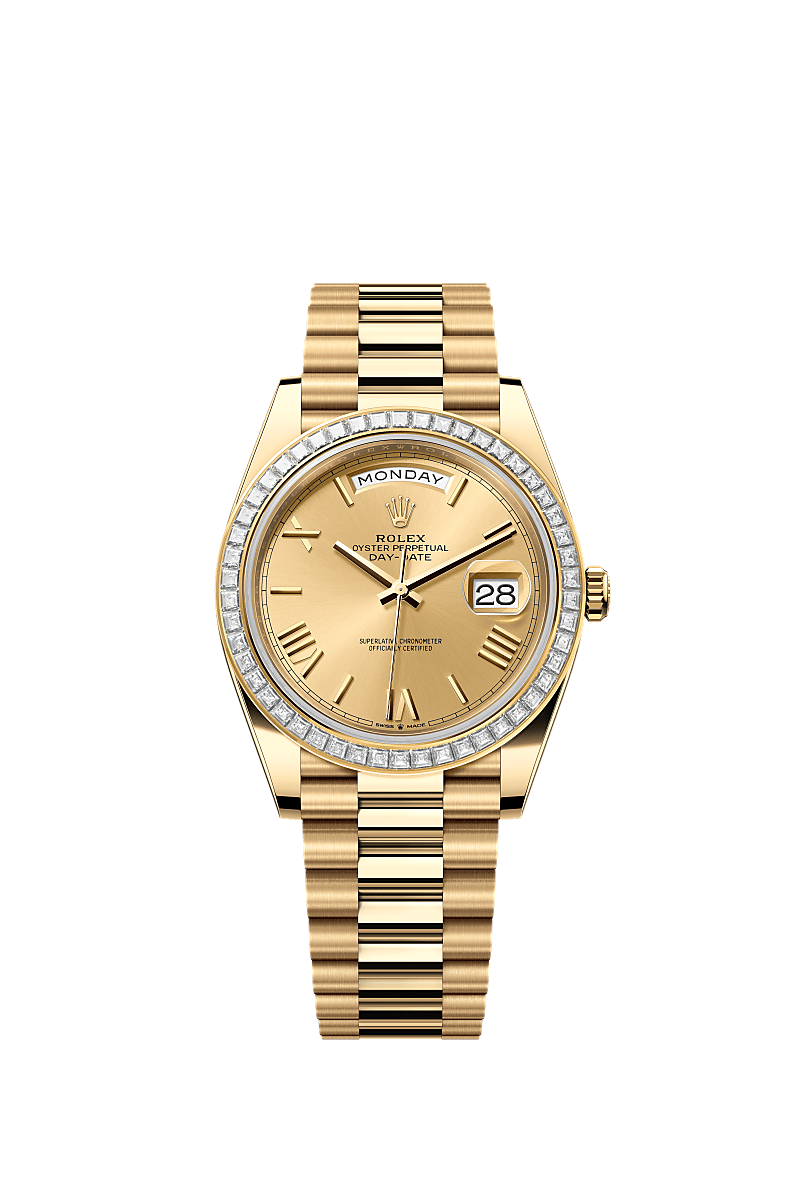 蚝式恒动星期日历型 40腕表18K黄金款,搭配香槟色表盘、镶钻外圈及元首型(President)表带。