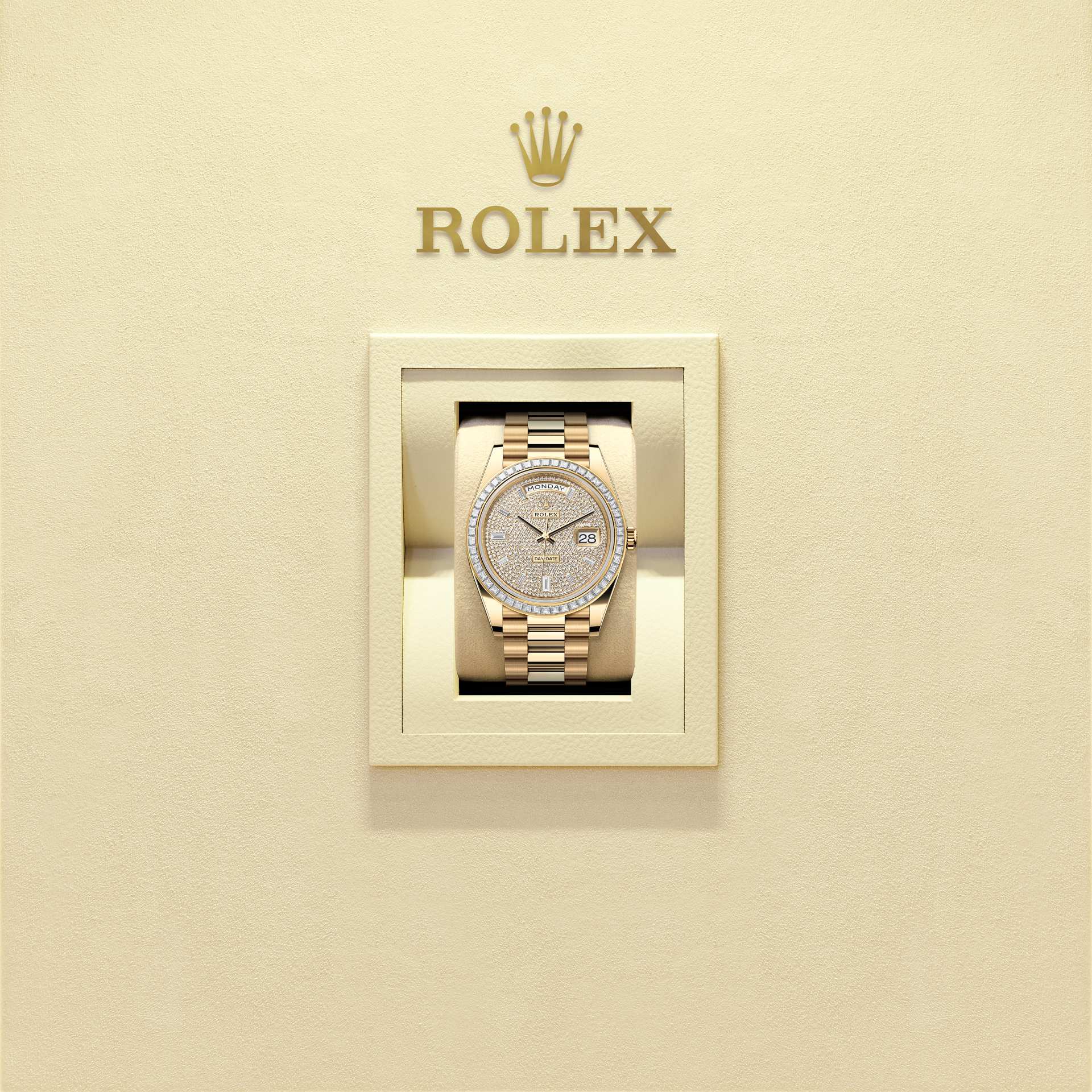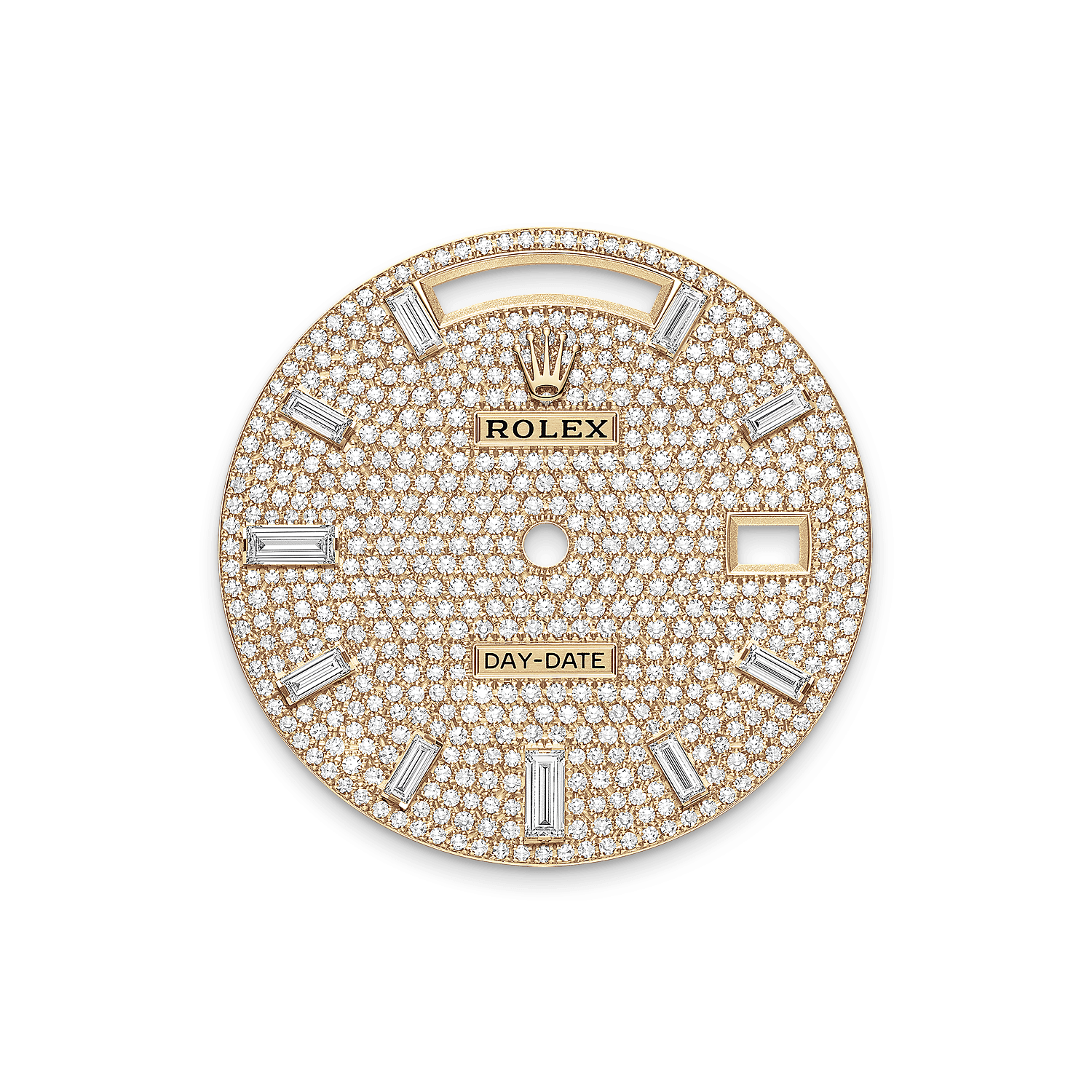 蚝式恒动星期日历型 40腕表18K黄金款,搭配密镶钻石表盘、镶钻外圈及元首型(President)表带。
