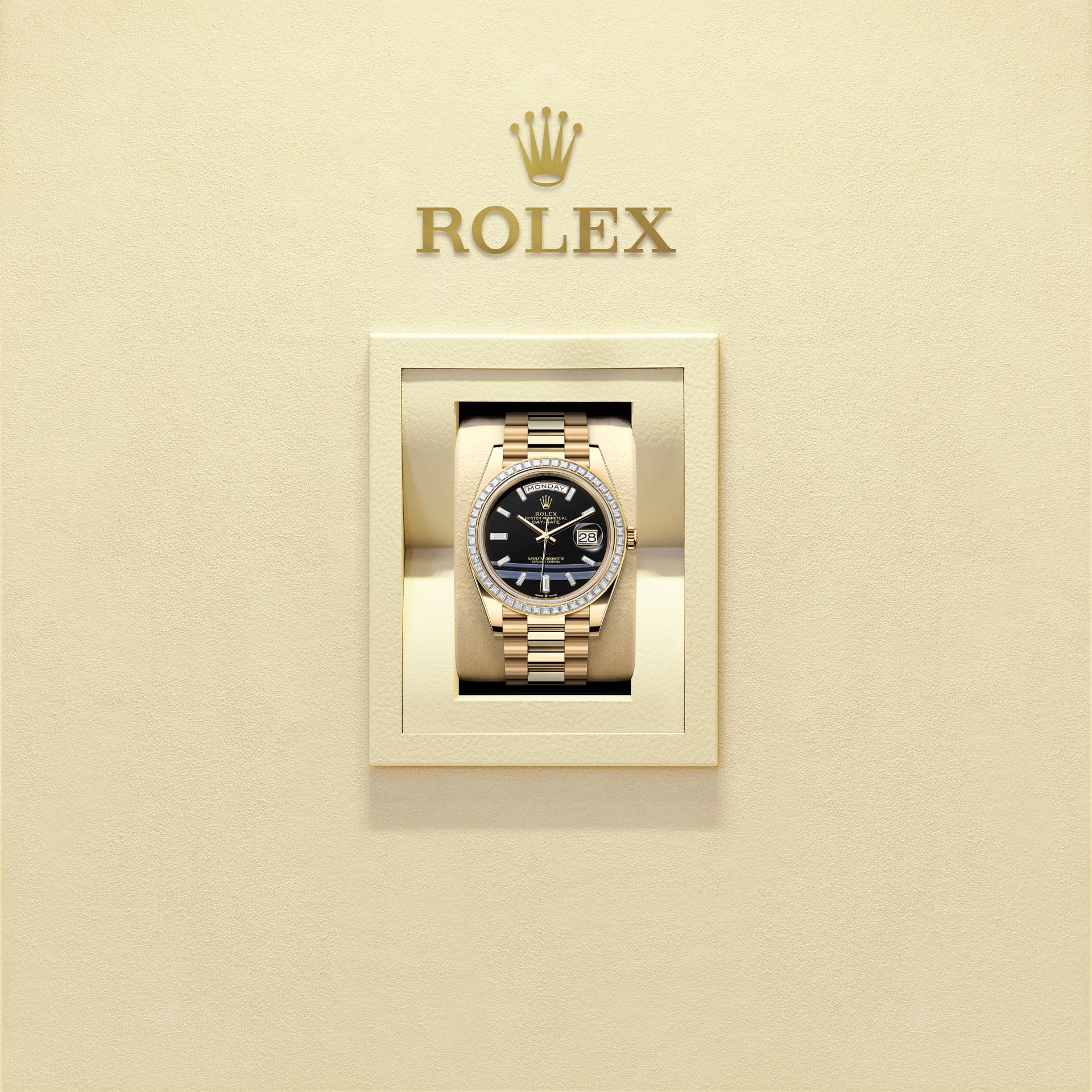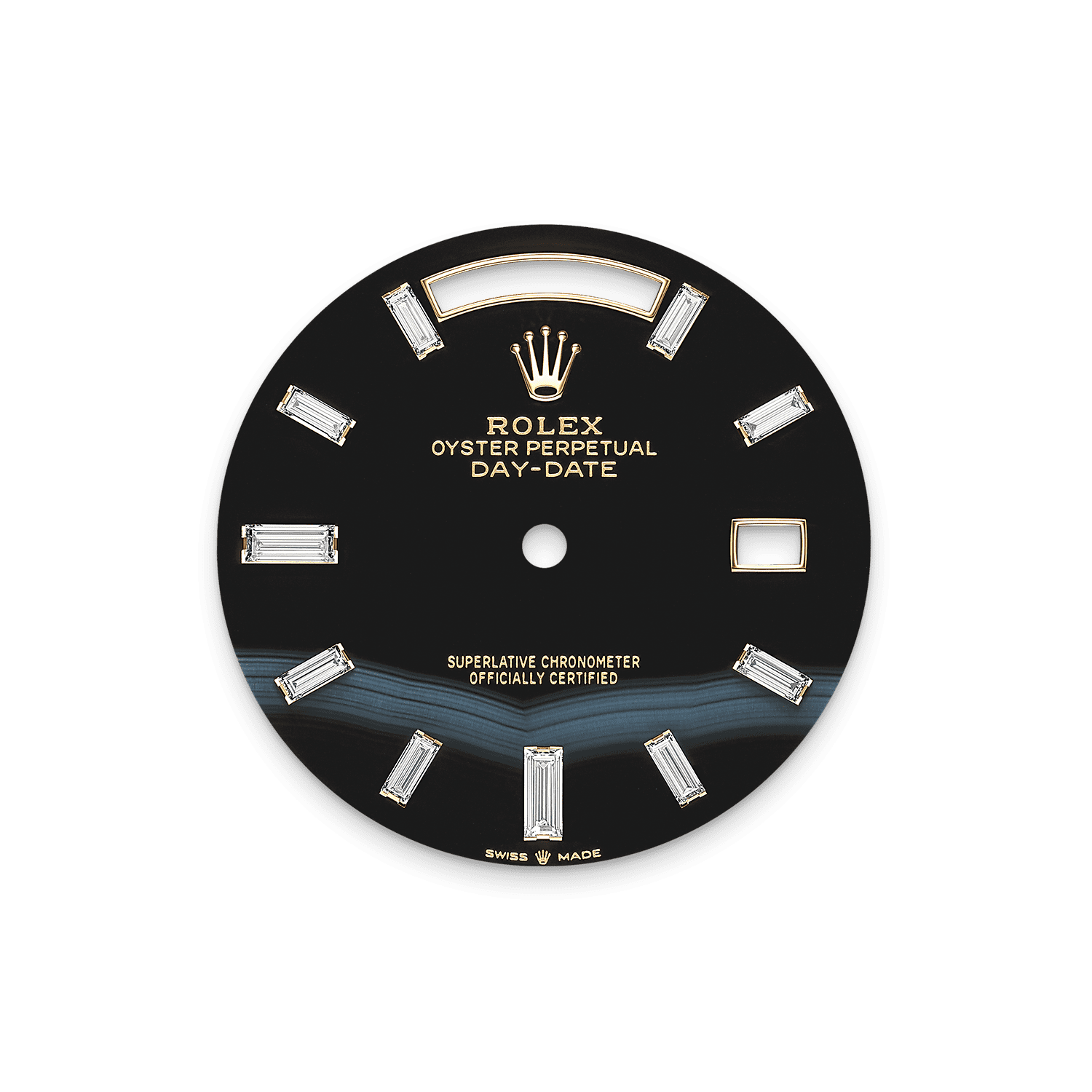 蚝式恒动星期日历型 40腕表18K黄金款,搭配镶钻缟玛瑙表盘、镶钻外圈及元首型(President)表带。