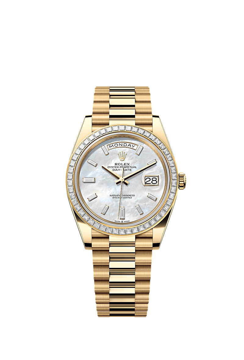 蚝式恒动星期日历型 40腕表18K黄金款,搭配镶钻白色珍珠母表盘、镶钻外圈及元首型(President)表带。