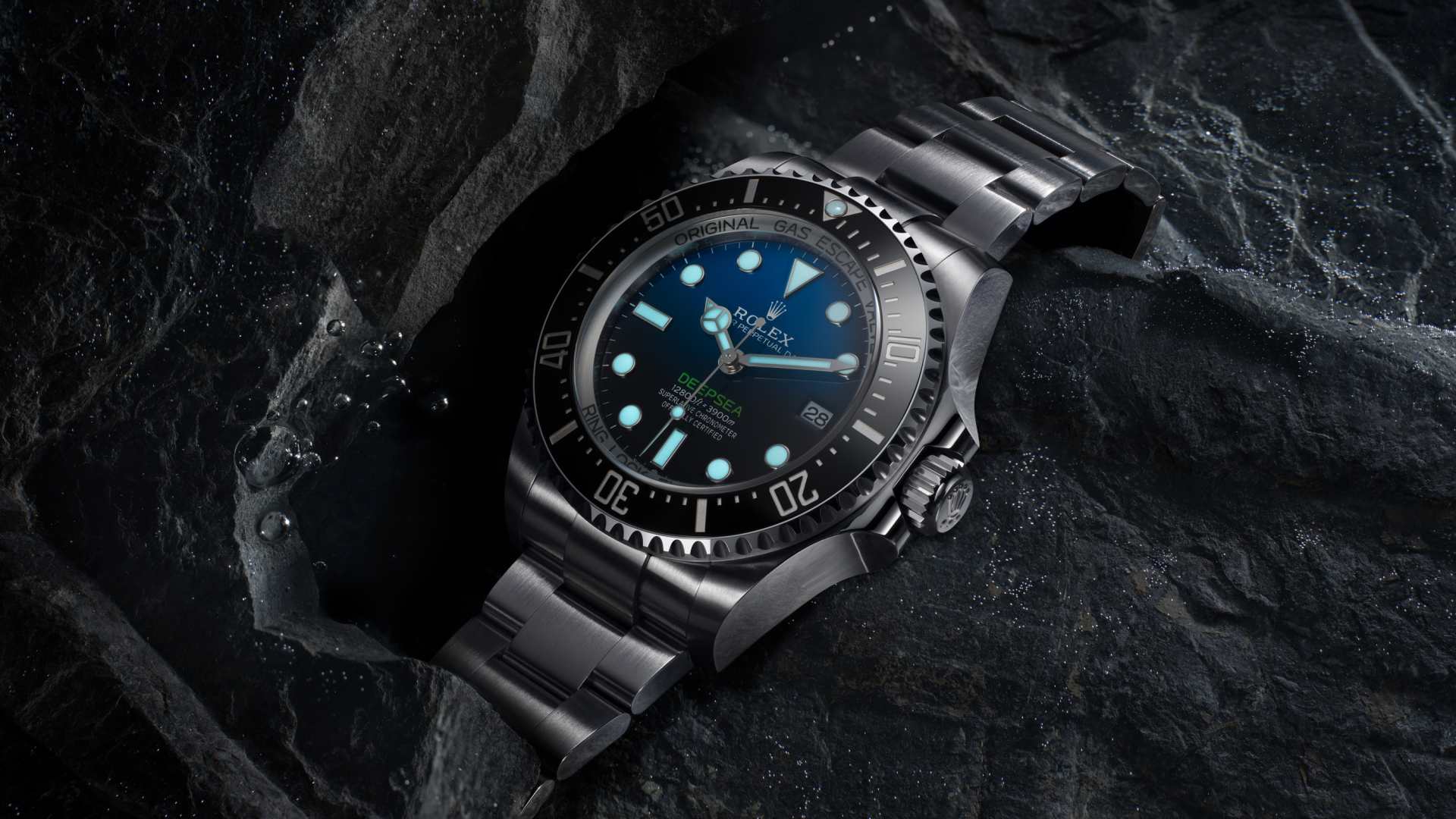 双色表盘由亮蓝色渐变为深邃的黑色,藉以记念卡梅隆成功抵达马里亚纳海沟(Mariana Trench)的地球最深处。