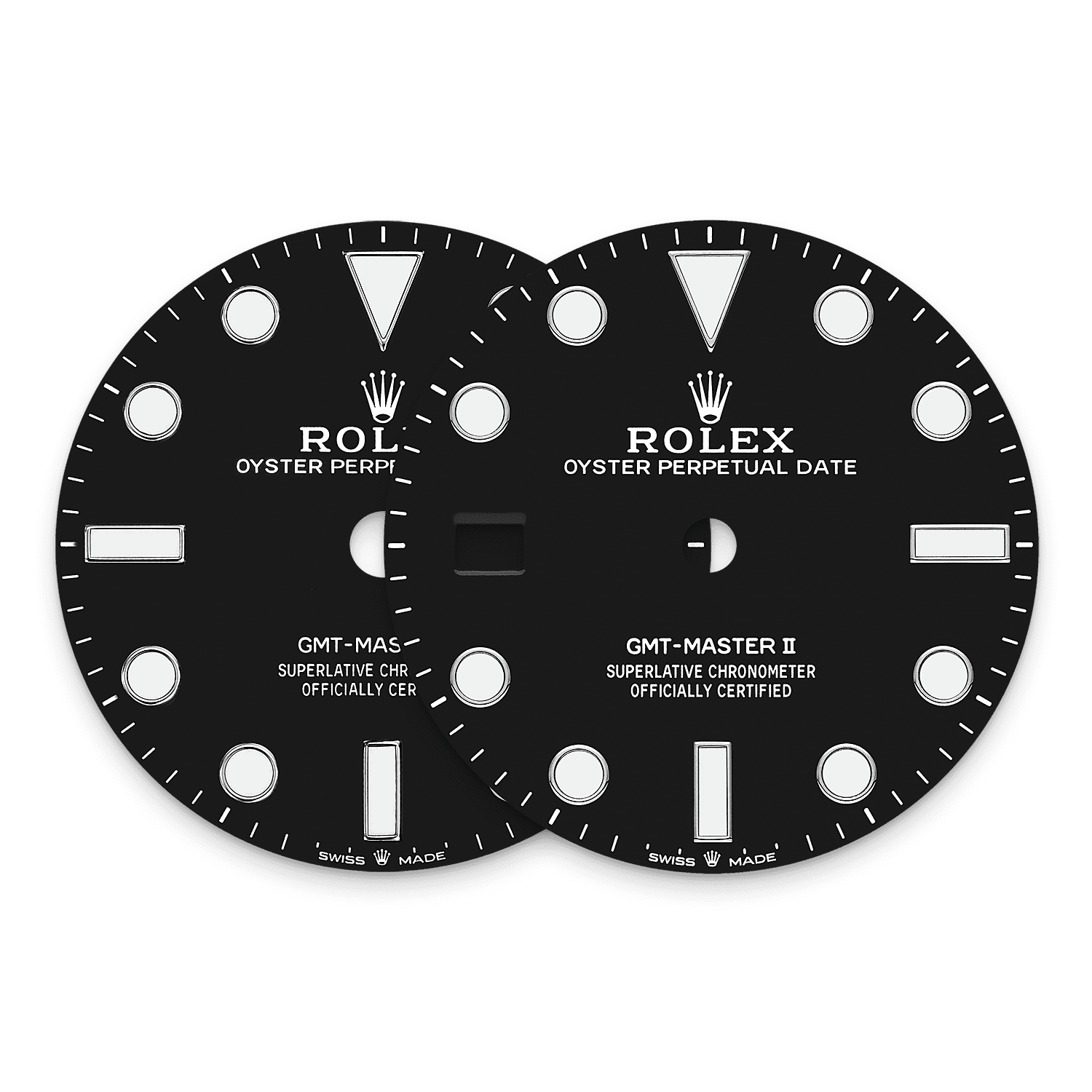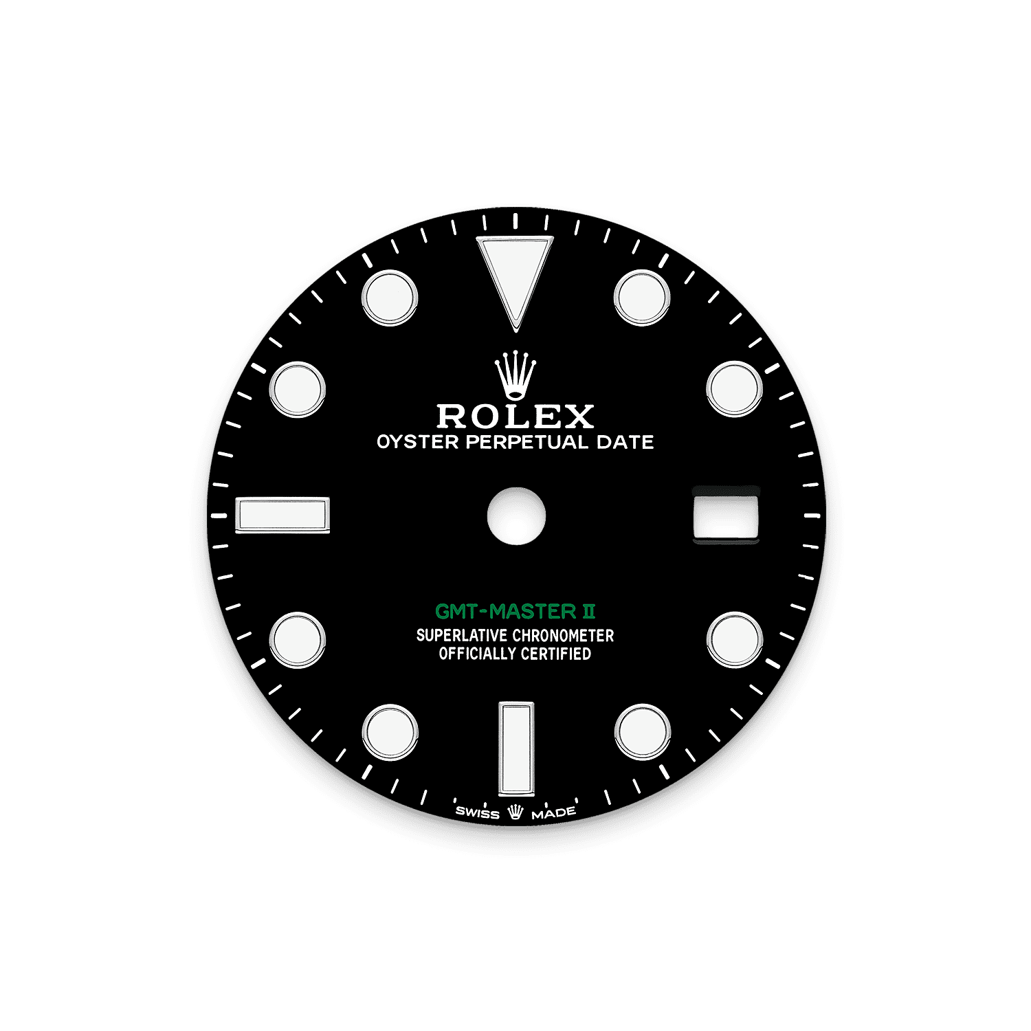 腕表采用黑色漆面表盘,镌刻绿色“GMT-Master II”(格林尼治型 II)字样。24小时指针亦呈绿色调。