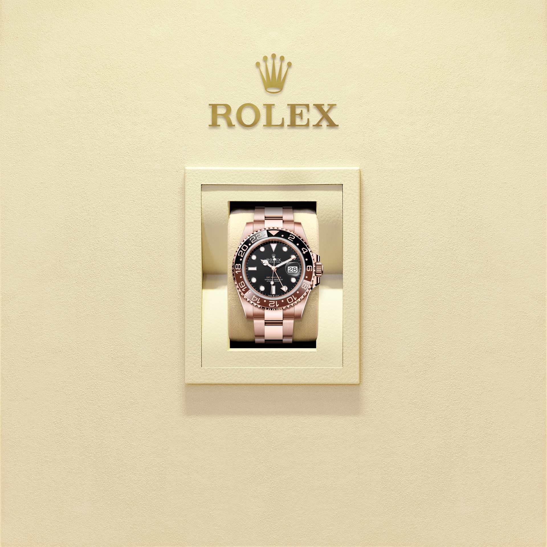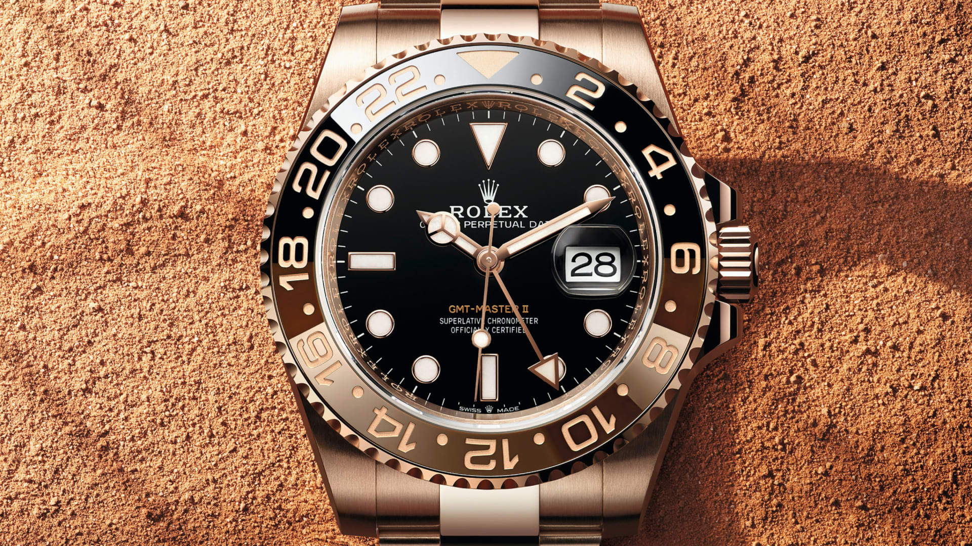 蚝式恒动格林尼治型 II腕表18K永恒玫瑰金款,搭配黑色表盘及蚝式(Oyster)表带。