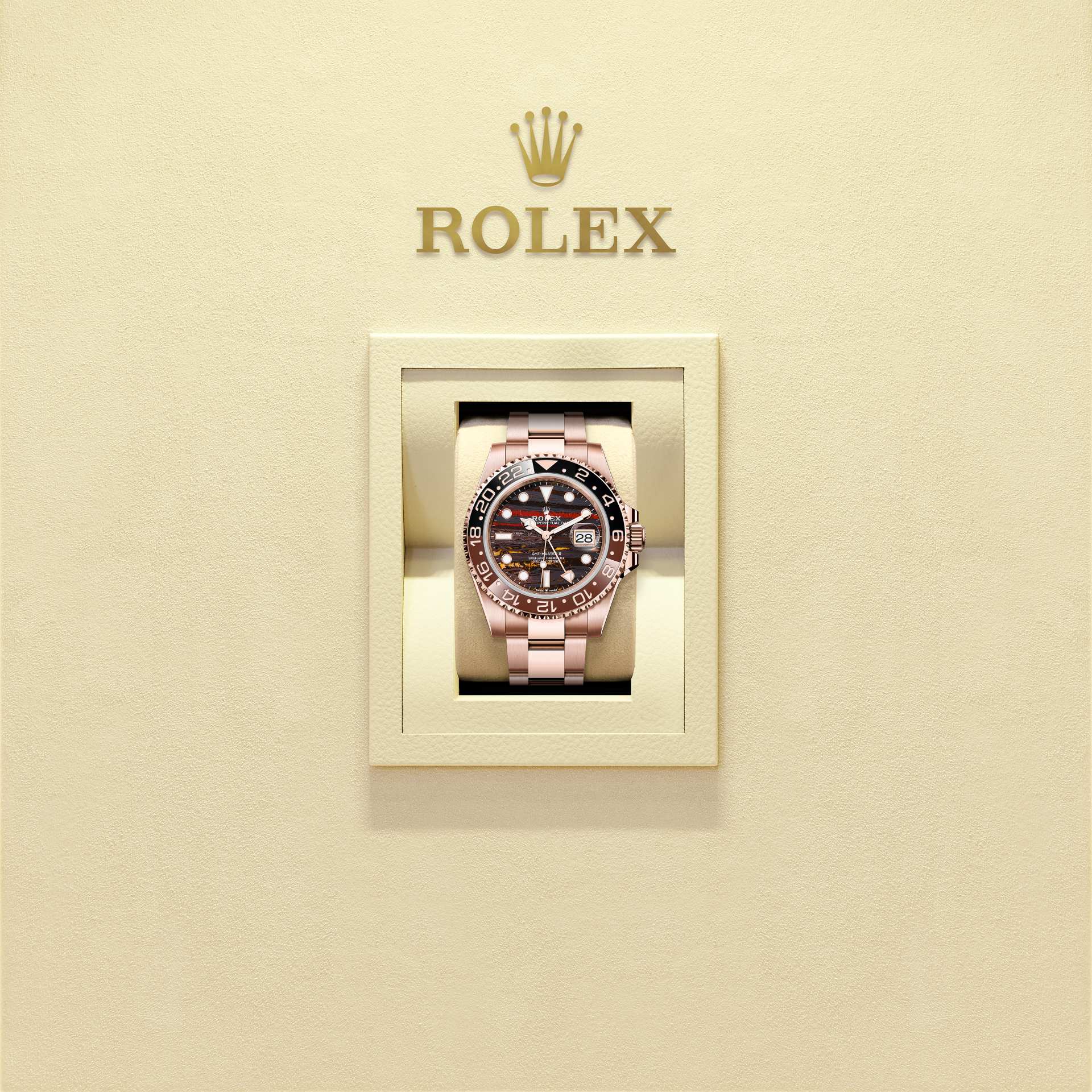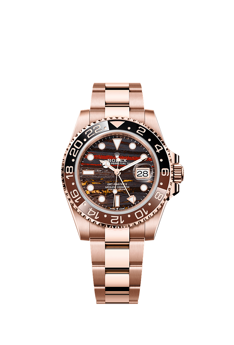 蚝式恒动格林尼治型 II腕表18K永恒玫瑰金款,搭配铁虎眼石表盘及蚝式(Oyster)表带。