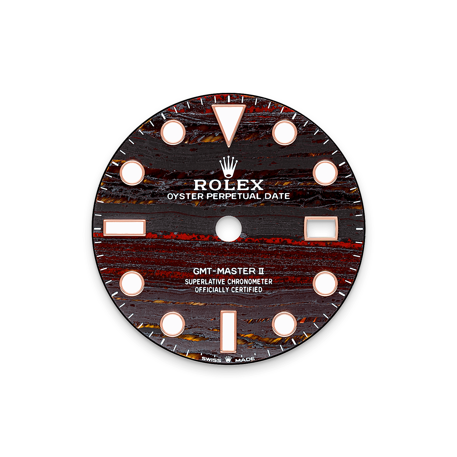 此宝石由虎眼石、红碧玉及银色赤铁矿三种矿石构成,绽现金橙相间光泽。劳力士工匠精心挑选品质上乘的铁虎眼石,之后经由细致的组装工序,令铁虎眼石表面与表壳及表带的颜色相得益彰。