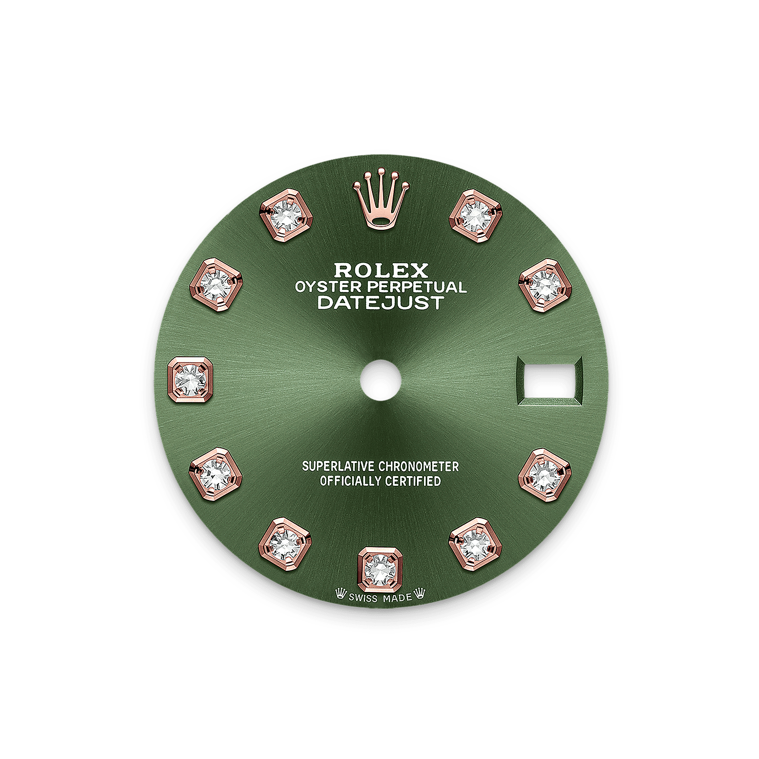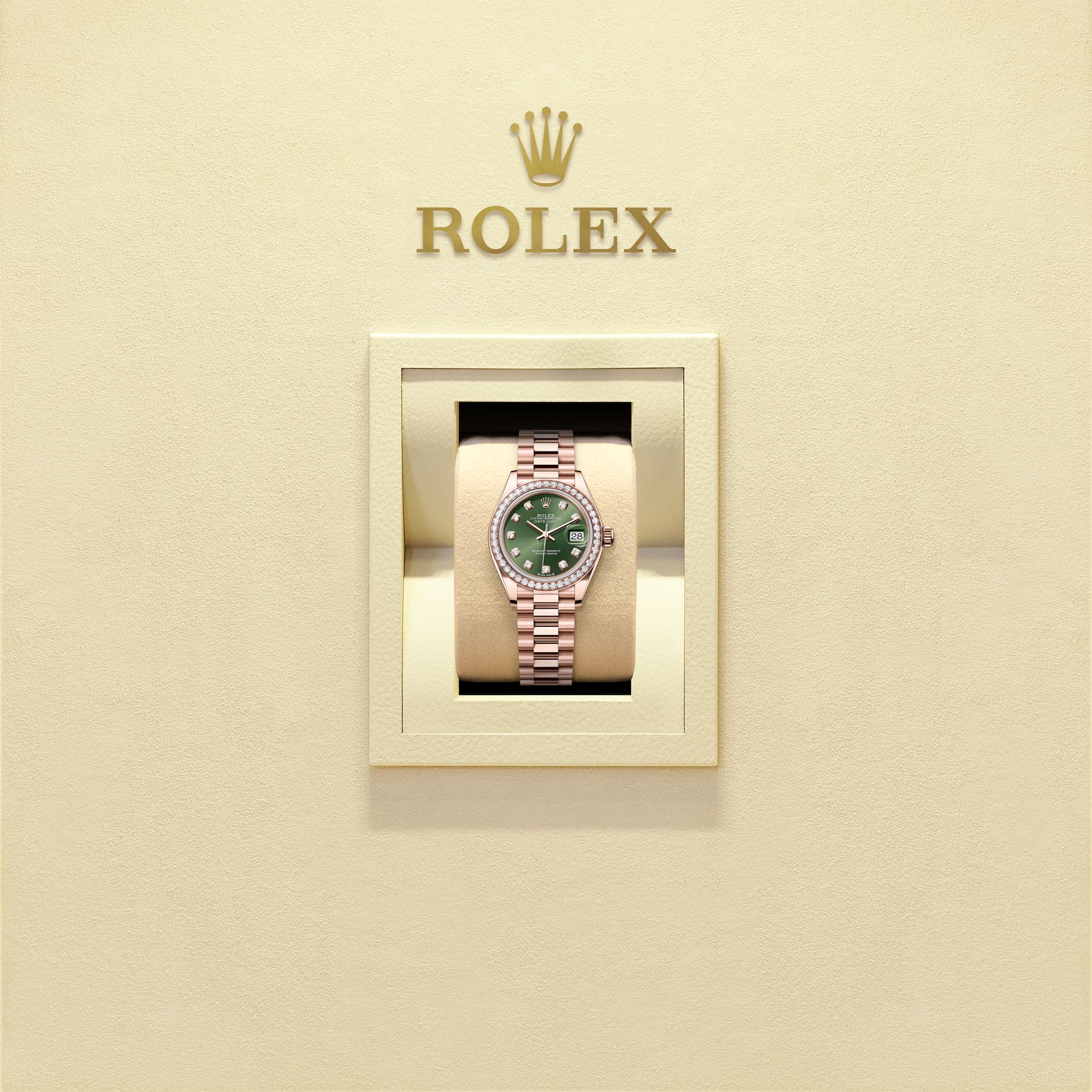 蚝式恒动女装日志型腕表18K永恒玫瑰金款,搭配镶钻橄榄绿色表盘及元首型(President)表带。