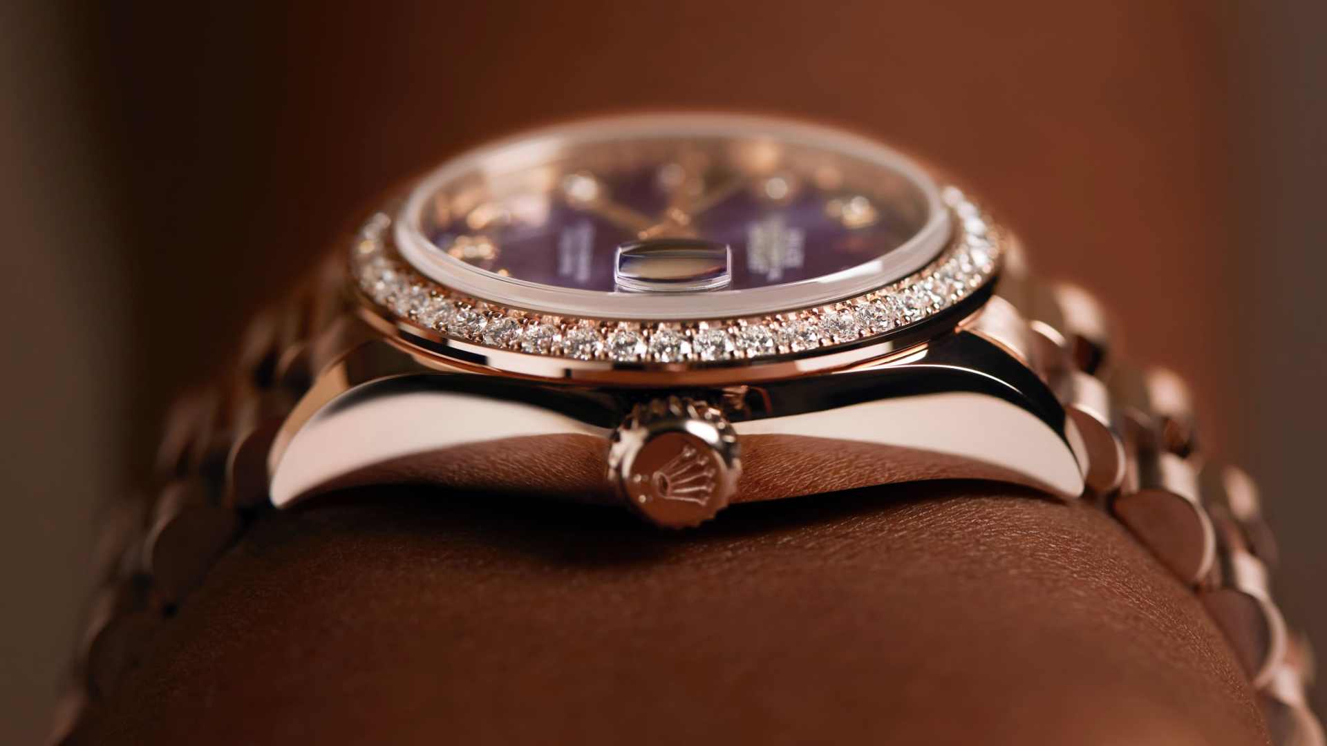 蚝式恒动女装日志型腕表18K永恒玫瑰金款,搭配镶钻茄紫色表盘及元首型(President)表带。