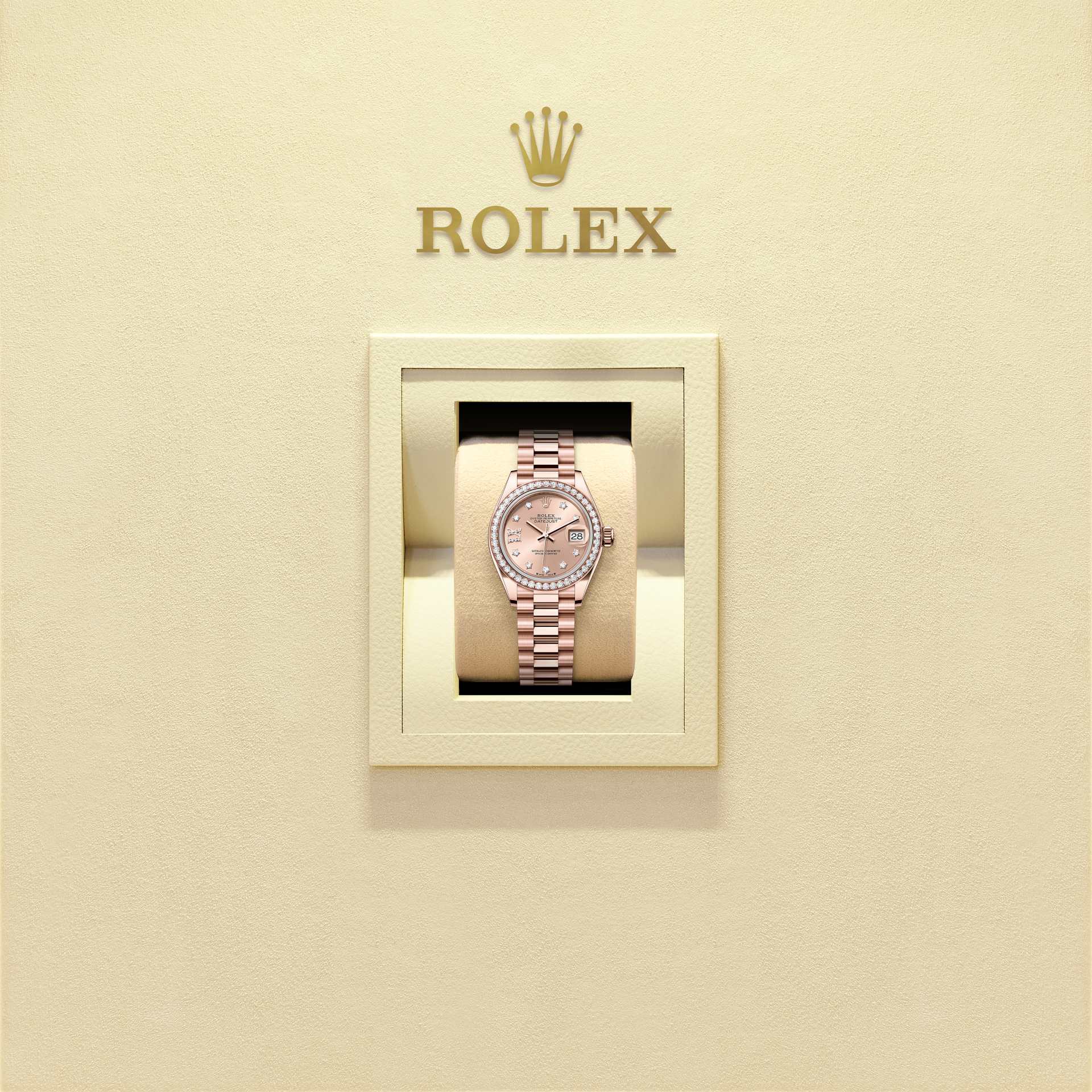 蚝式恒动女装日志型腕表18K永恒玫瑰金款,搭配镶钻玫瑰金色表盘及元首型(President)表带。