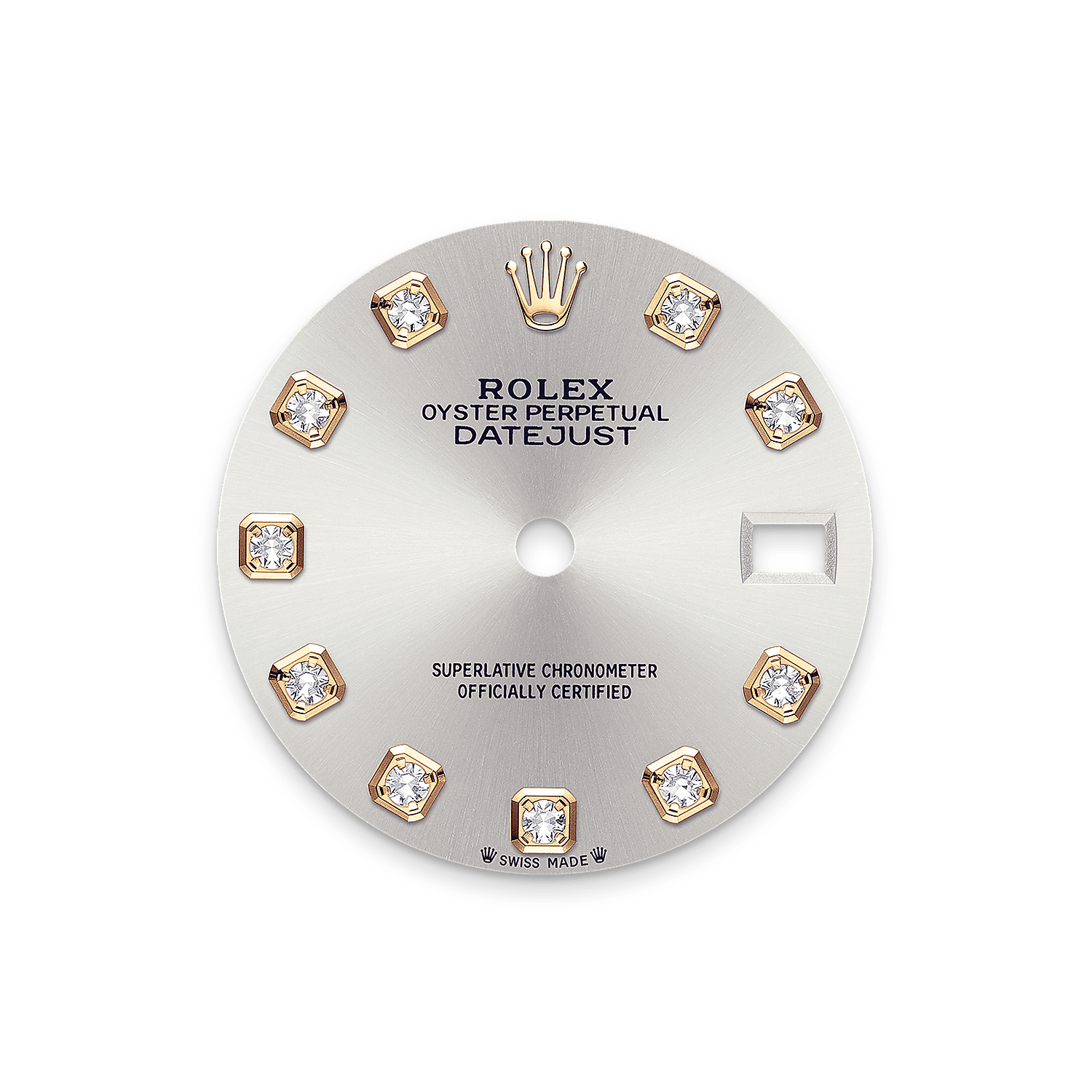 表盘设有18K金底座镶托钻石。蚝式系列的许多表盘款式均采用太阳光线效果,折射出淡雅光泽。这种效果需要超卓的刷光技术,打造从表盘中央往外扩展的刻纹。
