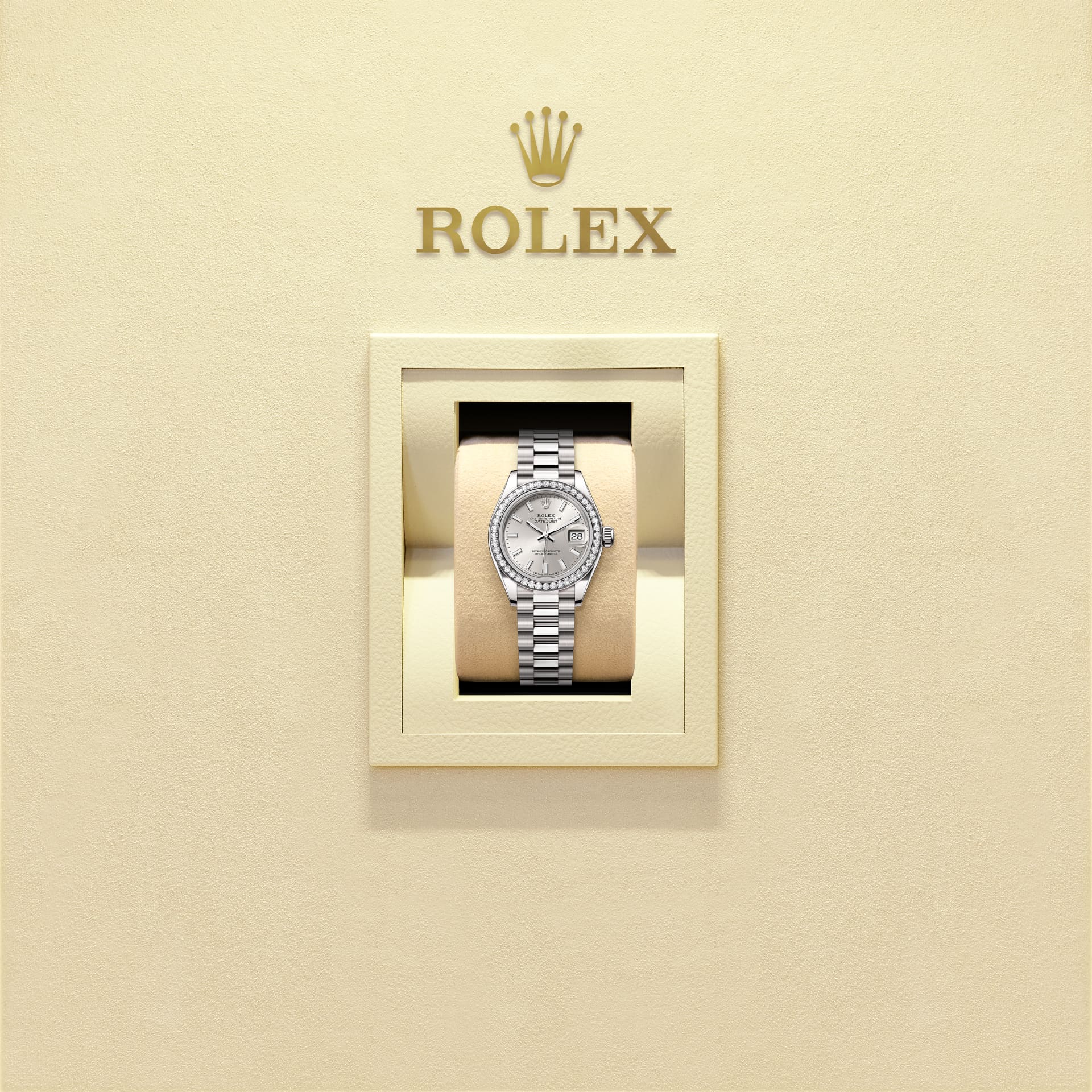 女装日志型搭配显赫尊贵的元首型(President)表带。外圈底下的隐蔽连接组件,确保表带和表壳之间达到无 缝连接的视觉效果,使纯金或铂金表带如虎添翼。