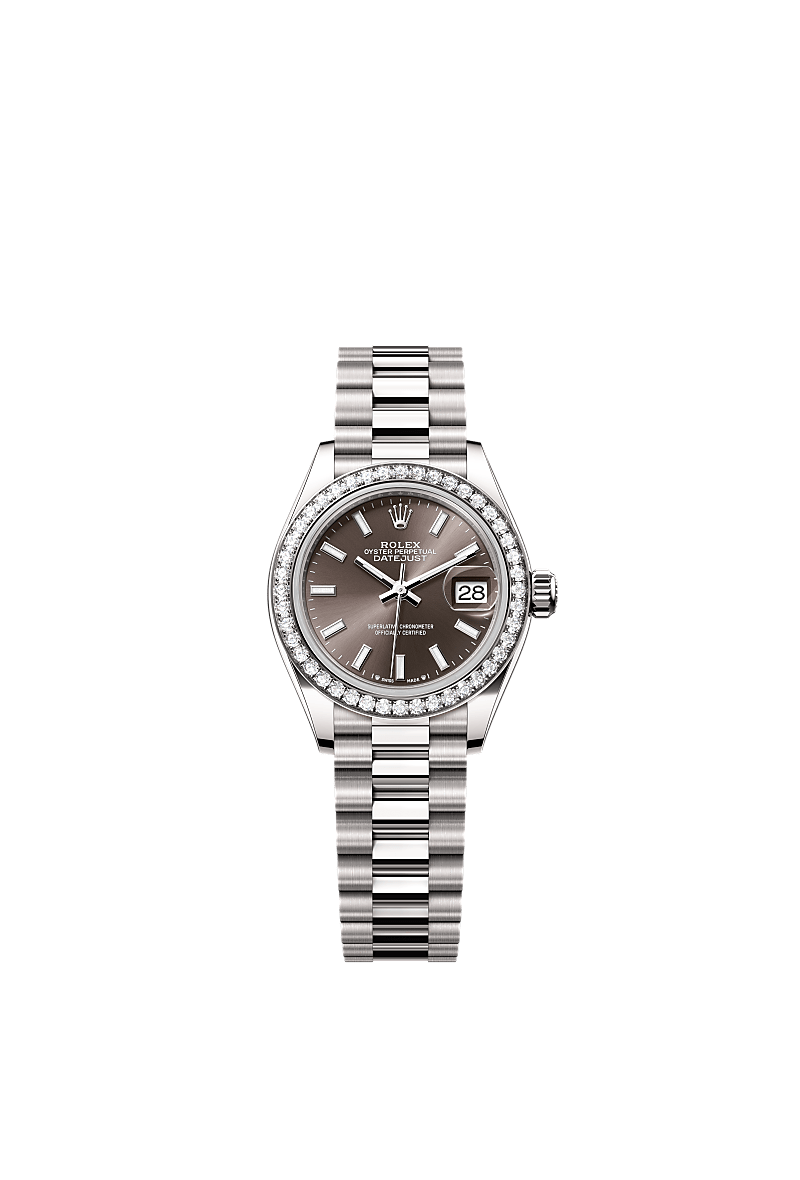 蚝式恒动女装日志型腕表18K白色黄金款,搭配深灰色表盘及元首型(President)表带。