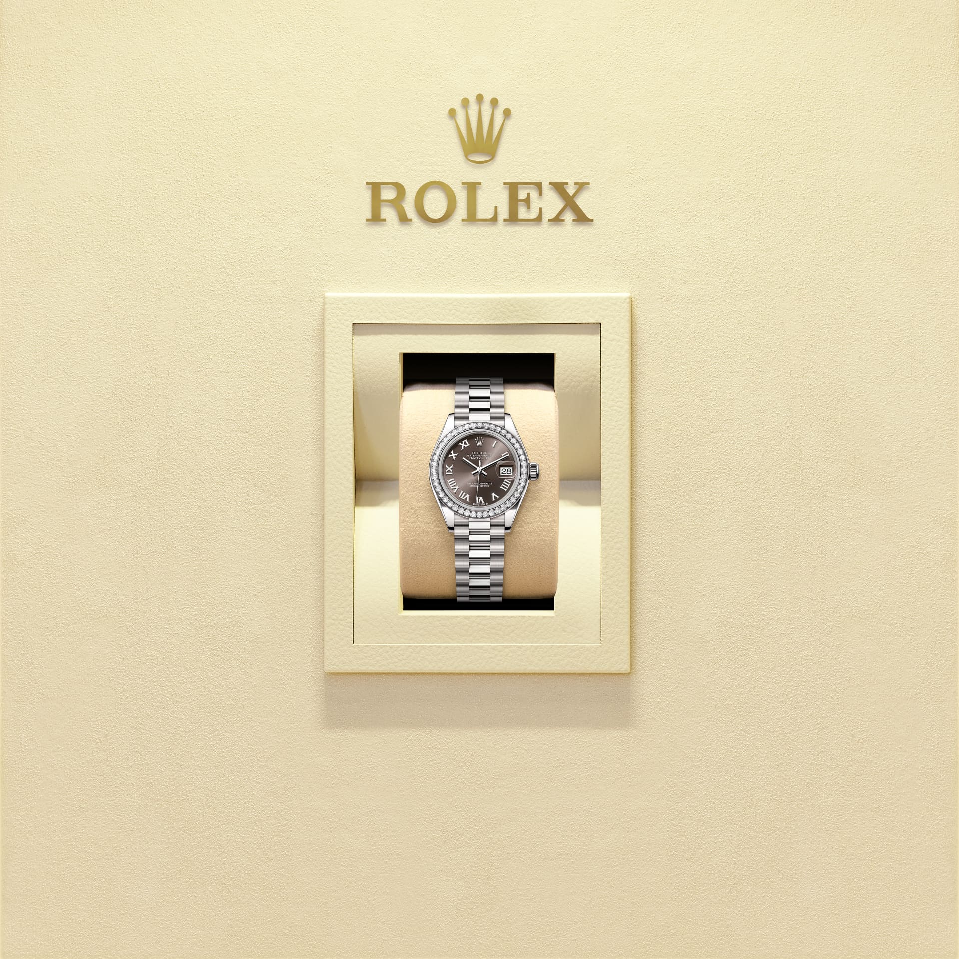 女装日志型搭配显赫尊贵的元首型(President)表带。外圈底下的隐蔽连接组件,确保表带和表壳之间达到无 缝连接的视觉效果,使纯金或铂金表带如虎添翼。