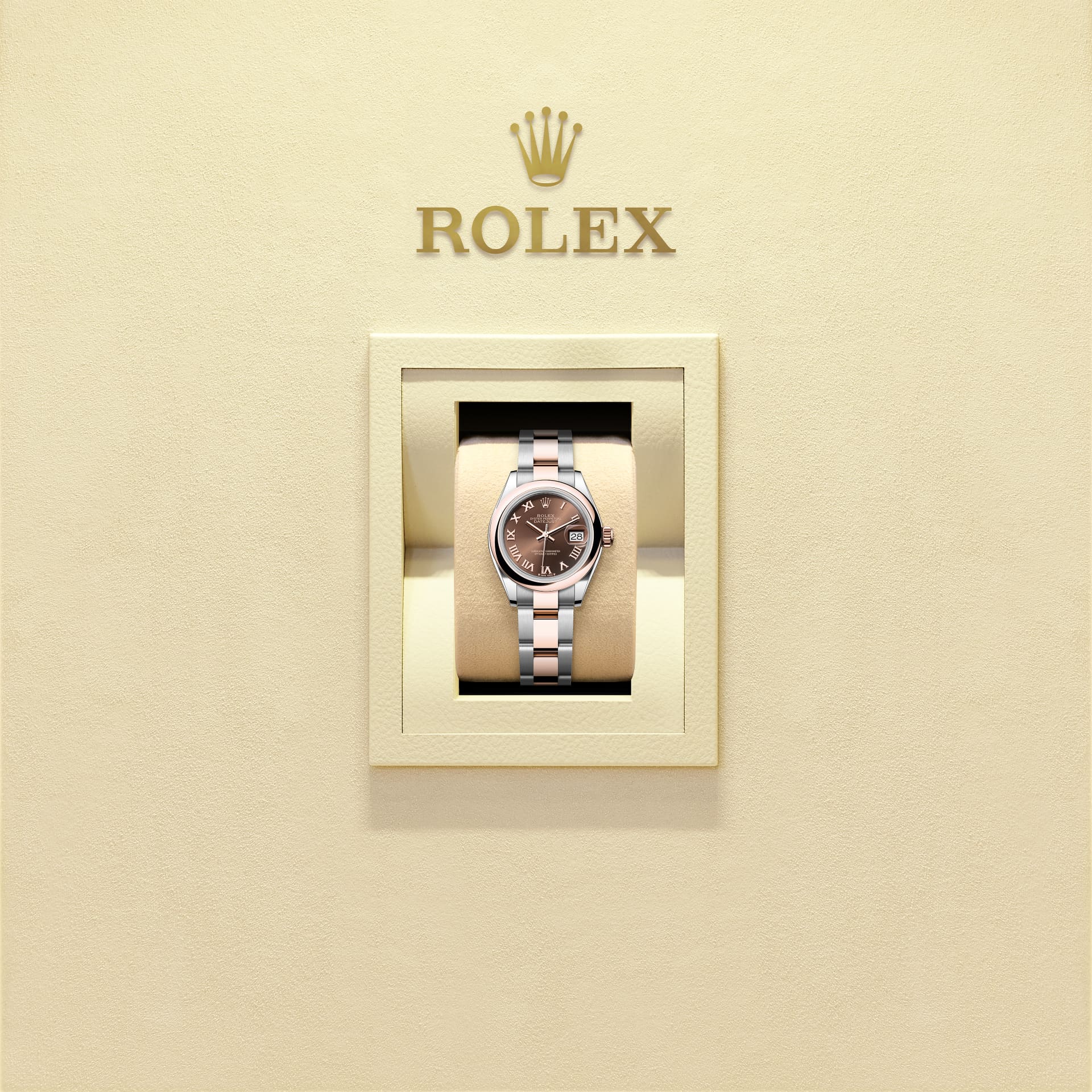 蚝式恒动女装日志型腕表永恒玫瑰金及蚝式钢款,搭配巧克力色表盘及蚝式(Oyster)表带。