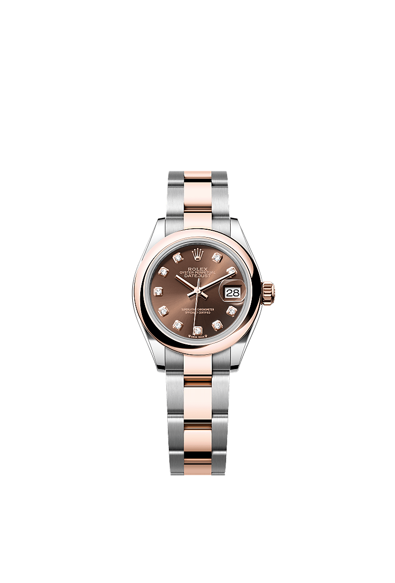 蚝式恒动女装日志型腕表永恒玫瑰金及蚝式钢款,搭配镶钻巧克力色表盘及蚝式(Oyster)表带。