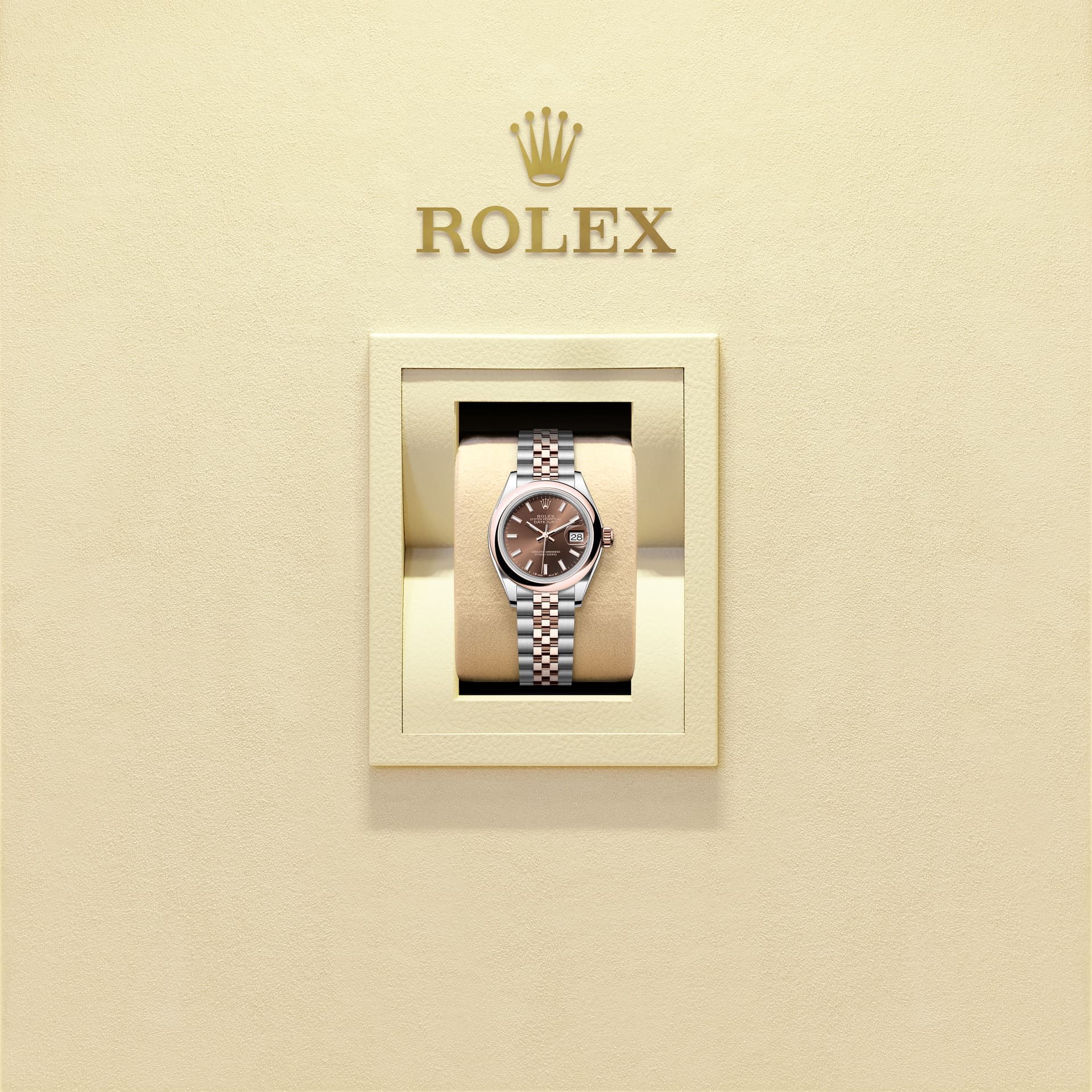 蚝式恒动女装日志型腕表永恒玫瑰金及蚝式钢款,搭配巧克力色表盘及纪念型(Jubilee)表带。