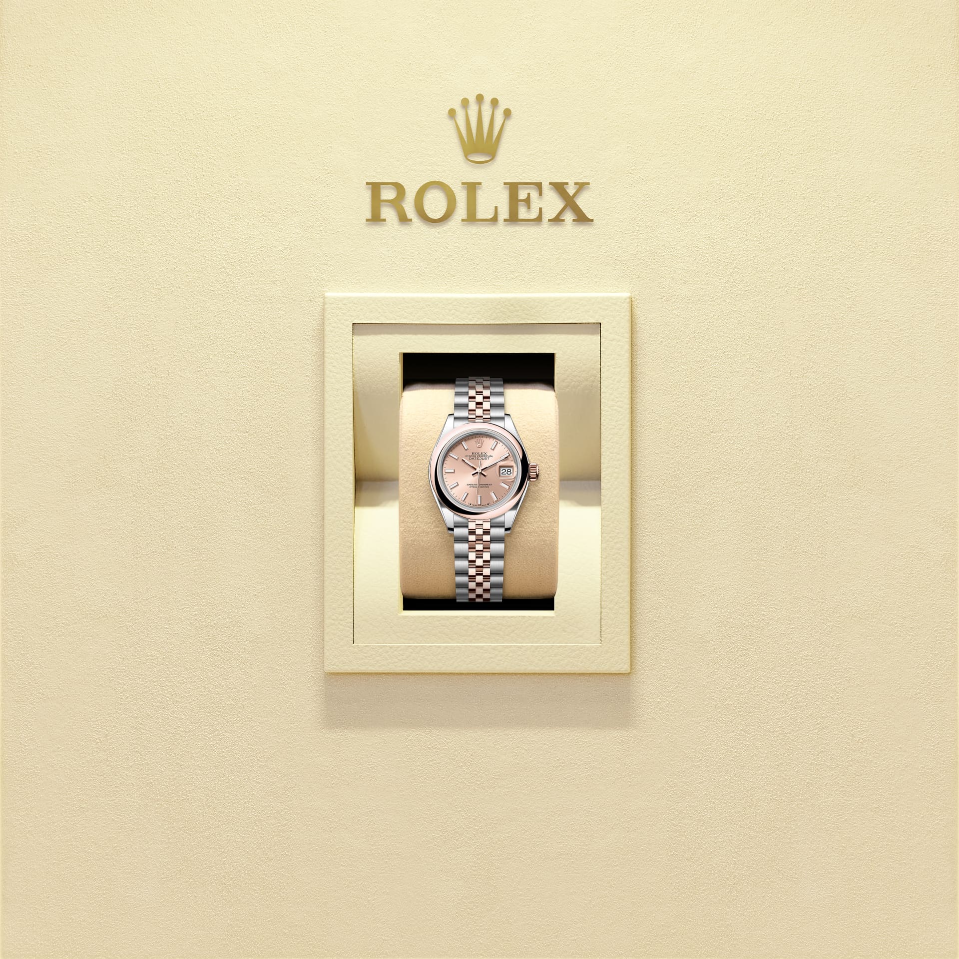 蚝式恒动女装日志型腕表永恒玫瑰金及蚝式钢款,搭配玫瑰金色表盘及纪念型(Jubilee)表带。