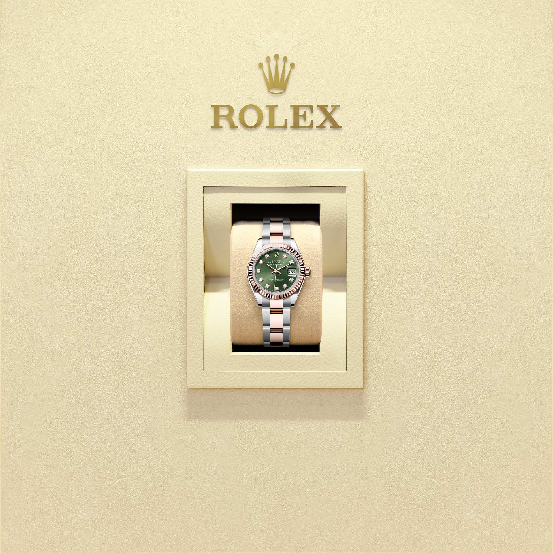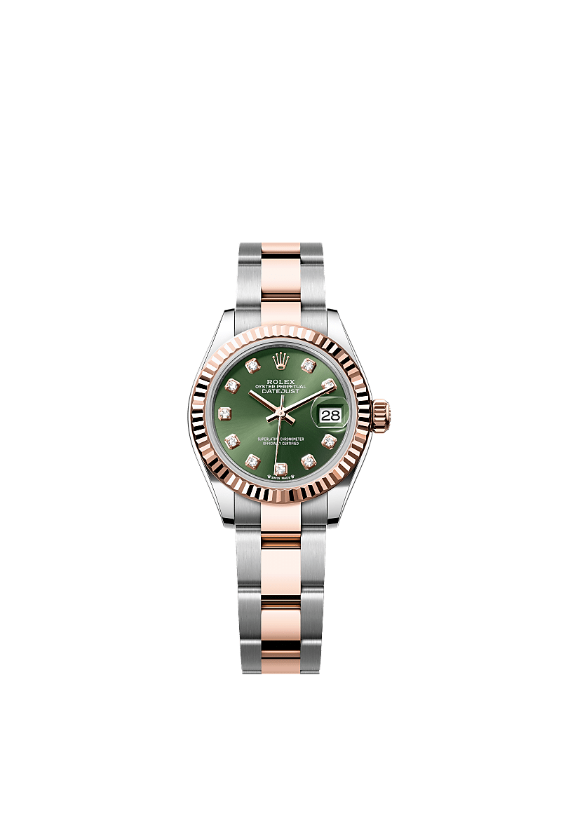 蚝式恒动女装日志型腕表永恒玫瑰金及蚝式钢款,搭配镶钻橄榄绿色表盘及蚝式(Oyster)表带。