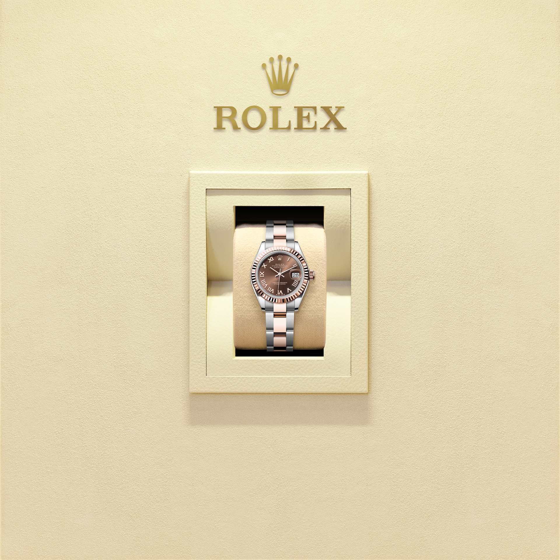 蚝式恒动女装日志型腕表永恒玫瑰金及蚝式钢款,搭配巧克力色表盘及蚝式(Oyster)表带。