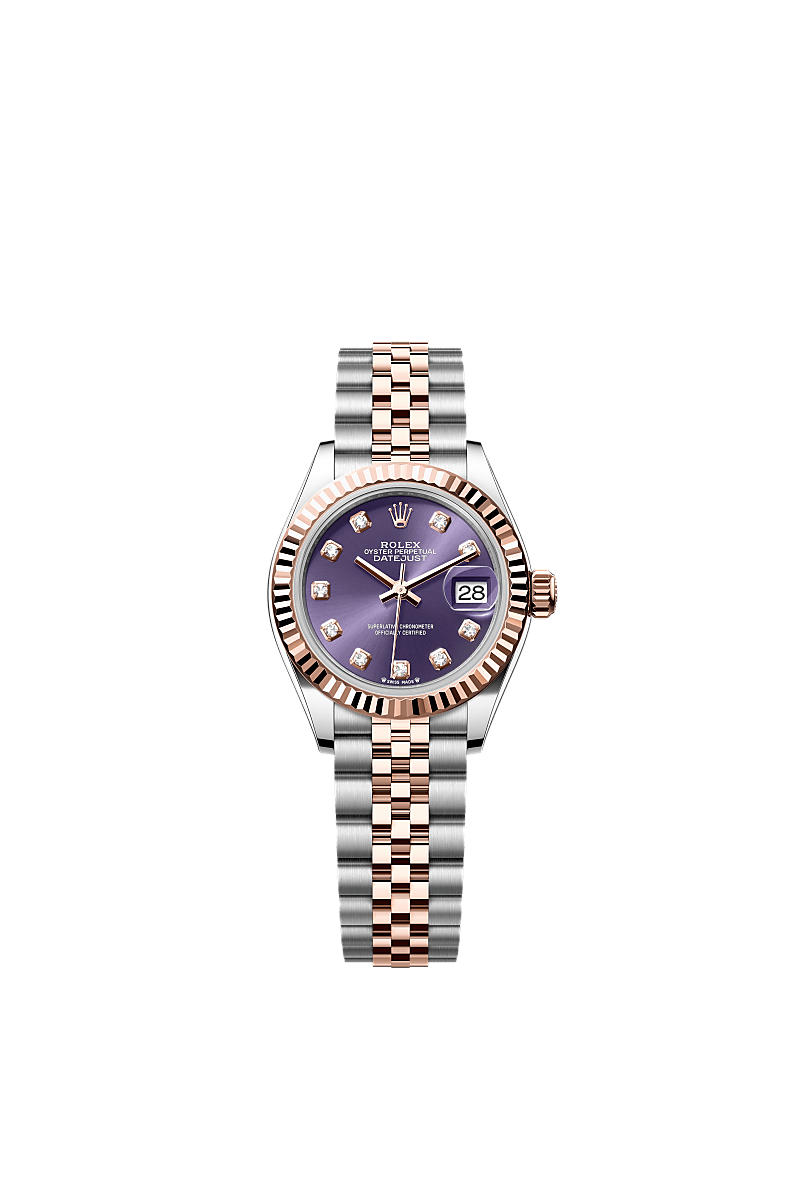 蚝式恒动女装日志型腕表永恒玫瑰金及蚝式钢款,搭配镶钻茄紫色表盘及纪念型(Jubilee)表带。
