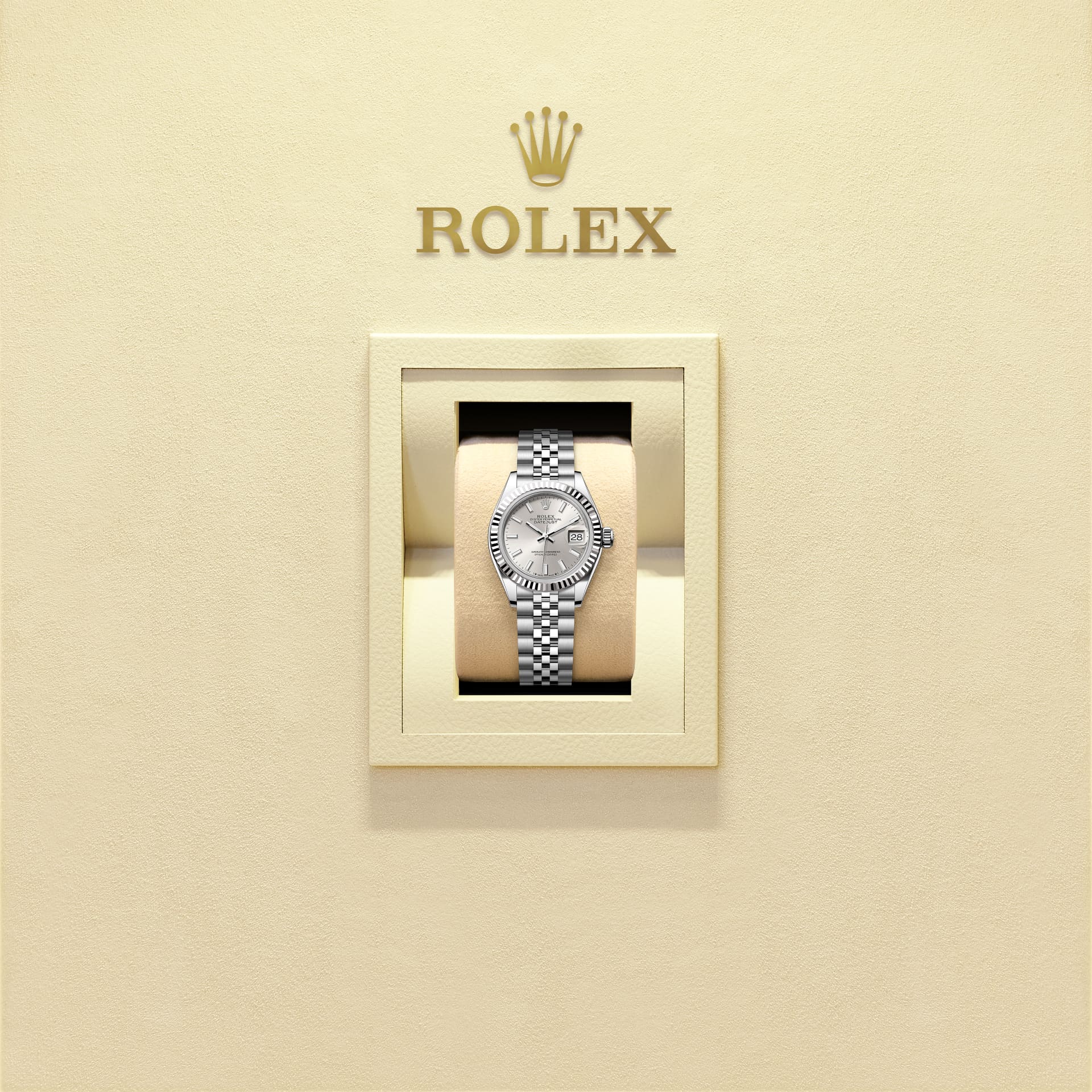 蚝式恒动女装日志型腕表白色黄金及蚝式钢款,搭配银色表盘及纪念型(Jubilee)表带。