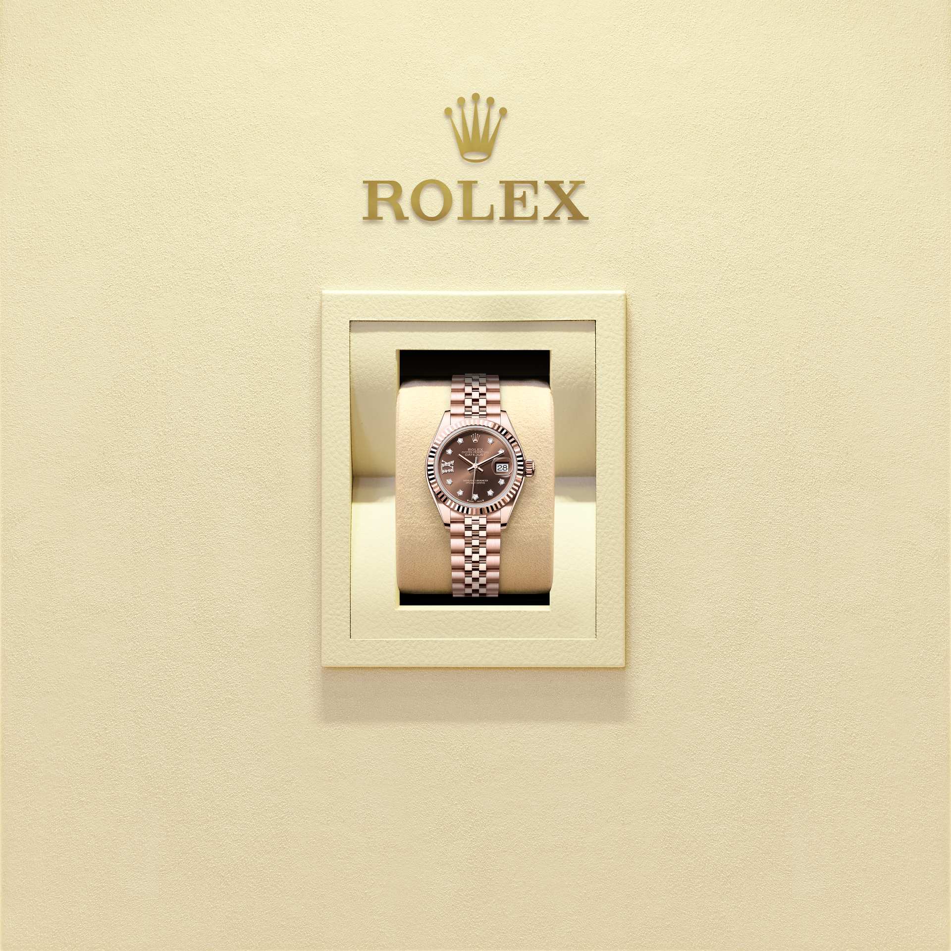 蚝式恒动女装日志型腕表18K永恒玫瑰金款,搭配镶钻巧克力色表盘及纪念型(Jubilee)表带。