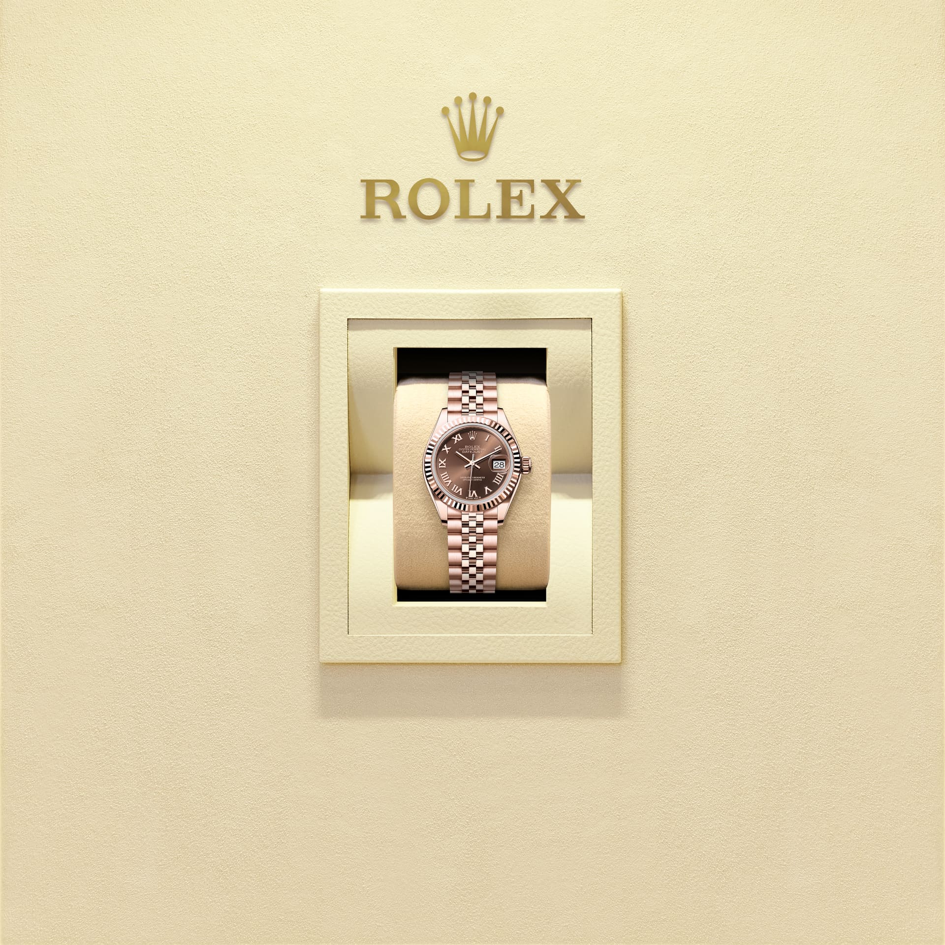 蚝式恒动女装日志型腕表18K永恒玫瑰金款,搭配巧克力色表盘及纪念型(Jubilee)表带。