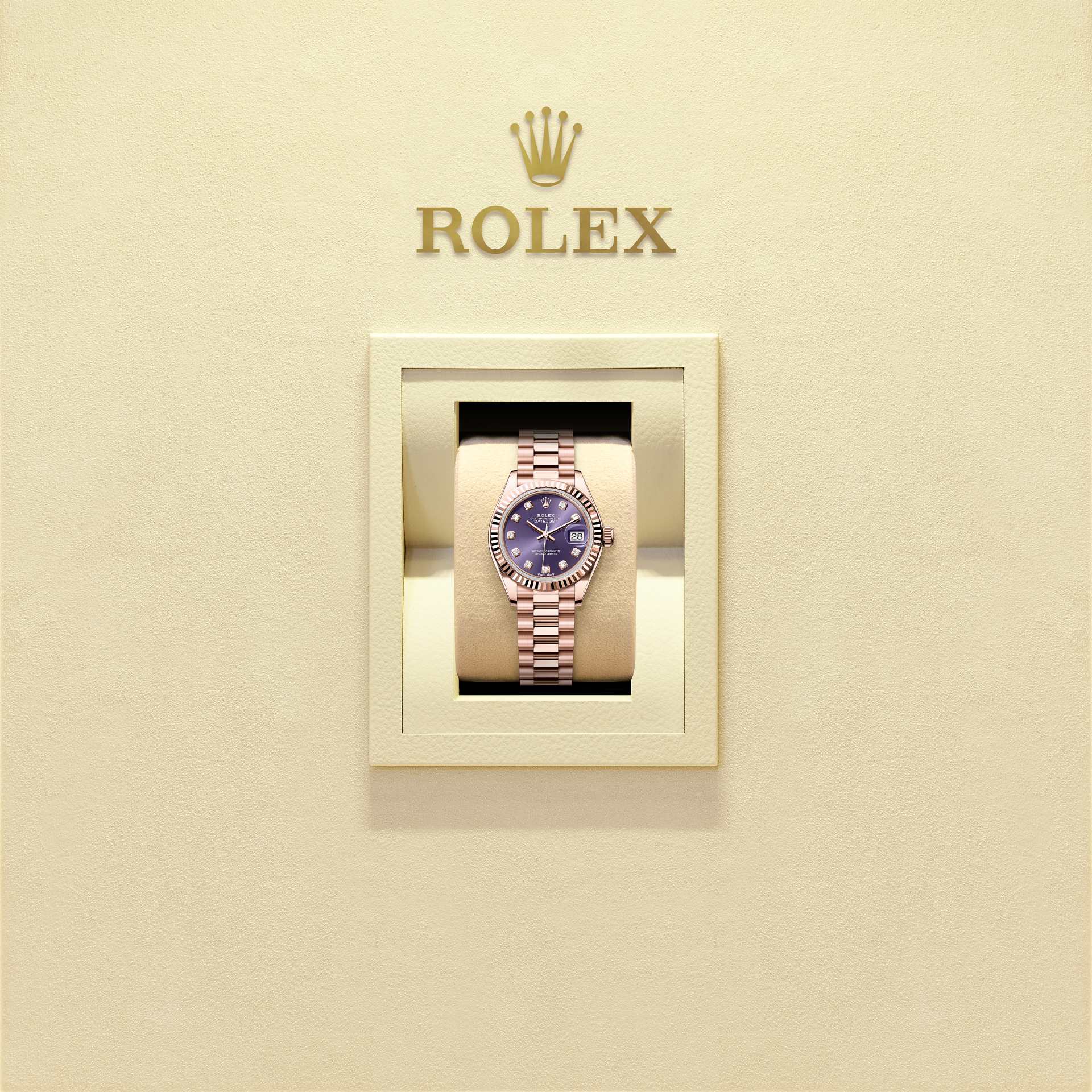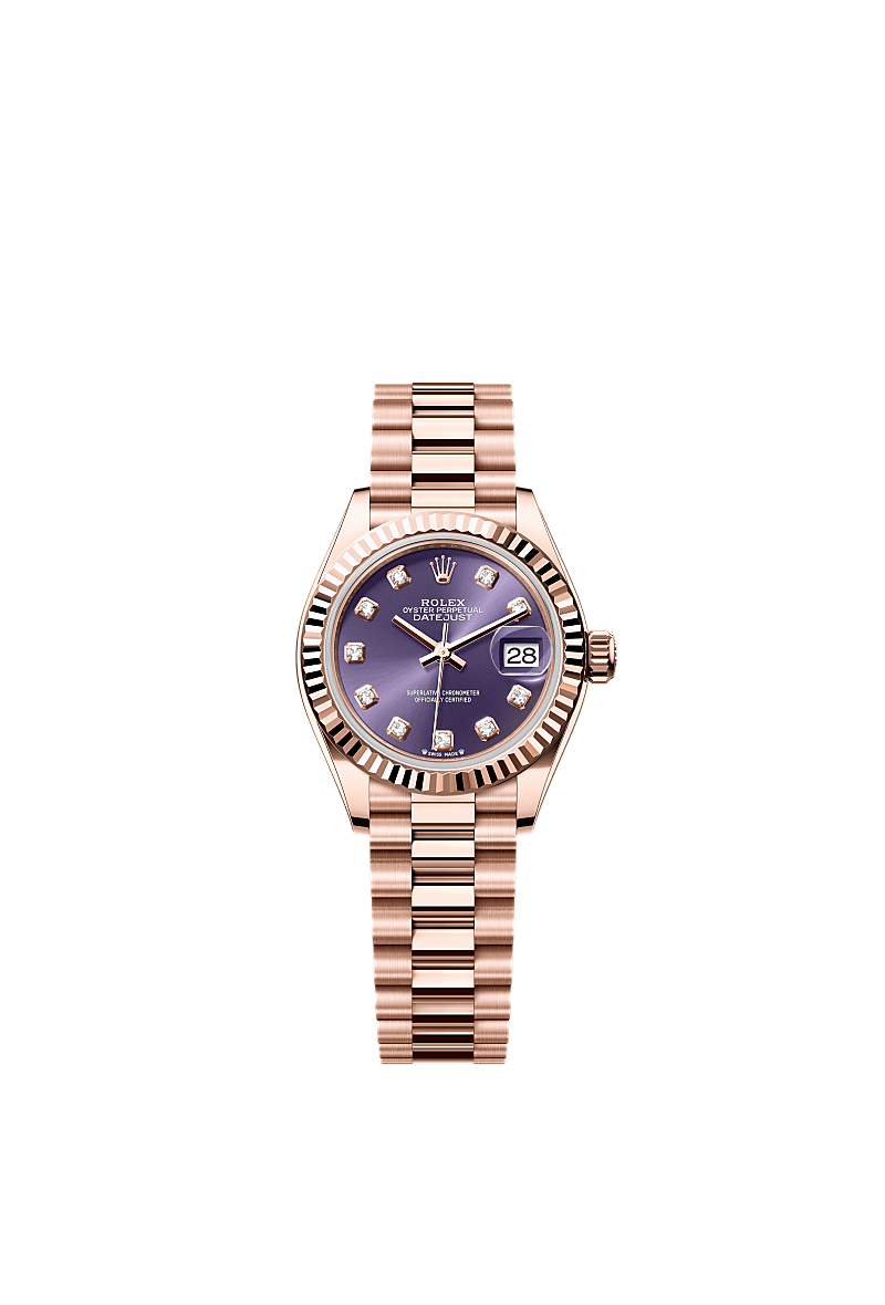 蚝式恒动女装日志型腕表18K永恒玫瑰金款,搭配镶钻茄紫色表盘及元首型(President)表带。