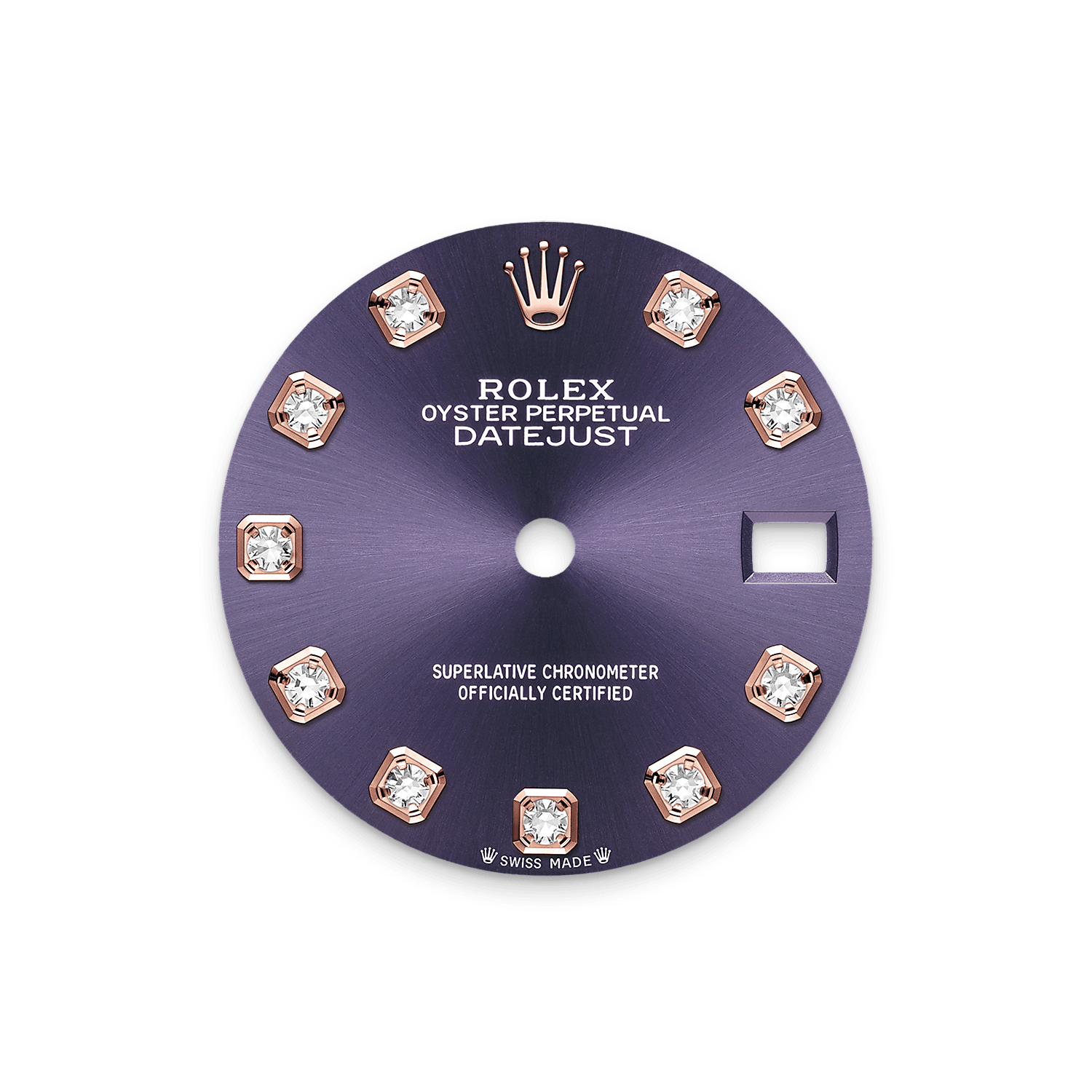 表盘设有18K金底座镶托钻石。蚝式系列的许多表盘款式均采用太阳光线效果,折射出淡雅光泽。这种效果需要超卓的刷光技术,打造从表盘中央往外扩展的刻纹。