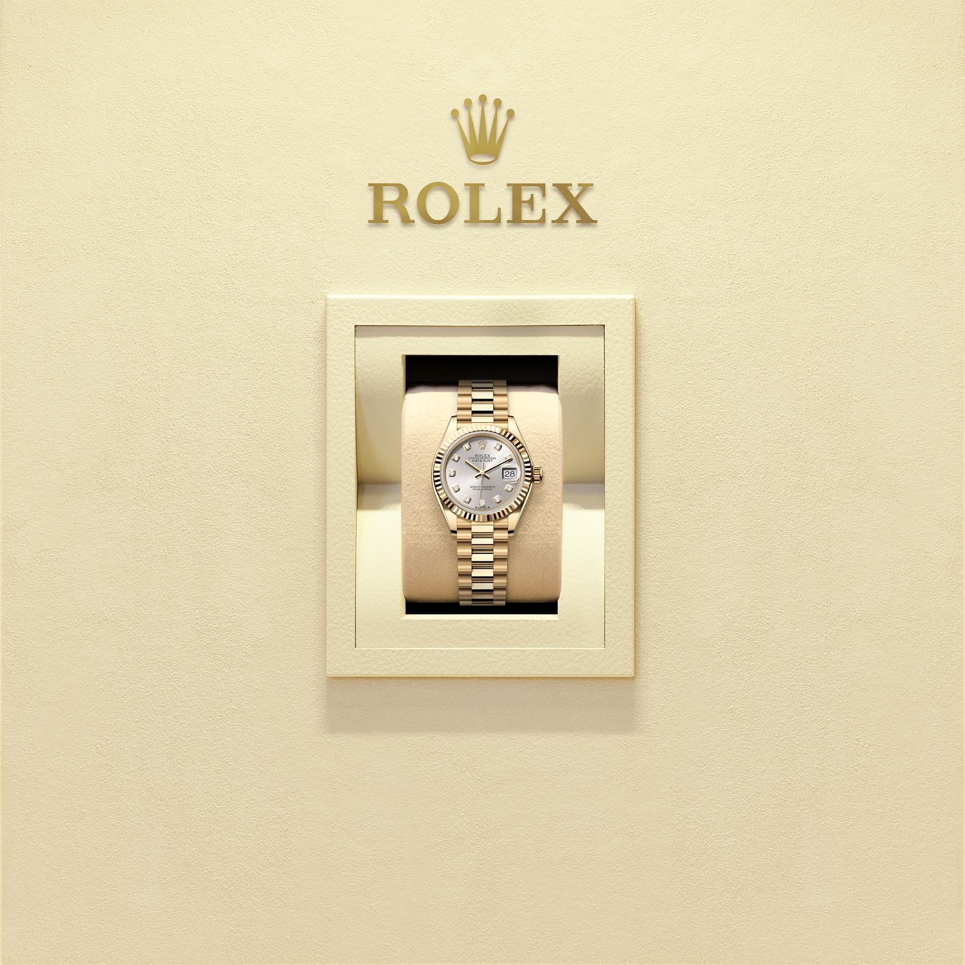 而底盖上可见的坑纹设计亦出于同样目的,并以特定的劳力士工具旋紧于表壳。及后,三角坑纹演变为一项美学设计元素,堪为劳力士的经典特色。时至今日,三角坑纹成为品牌腕表的特色,这款女装日志型的外圈以金制成。