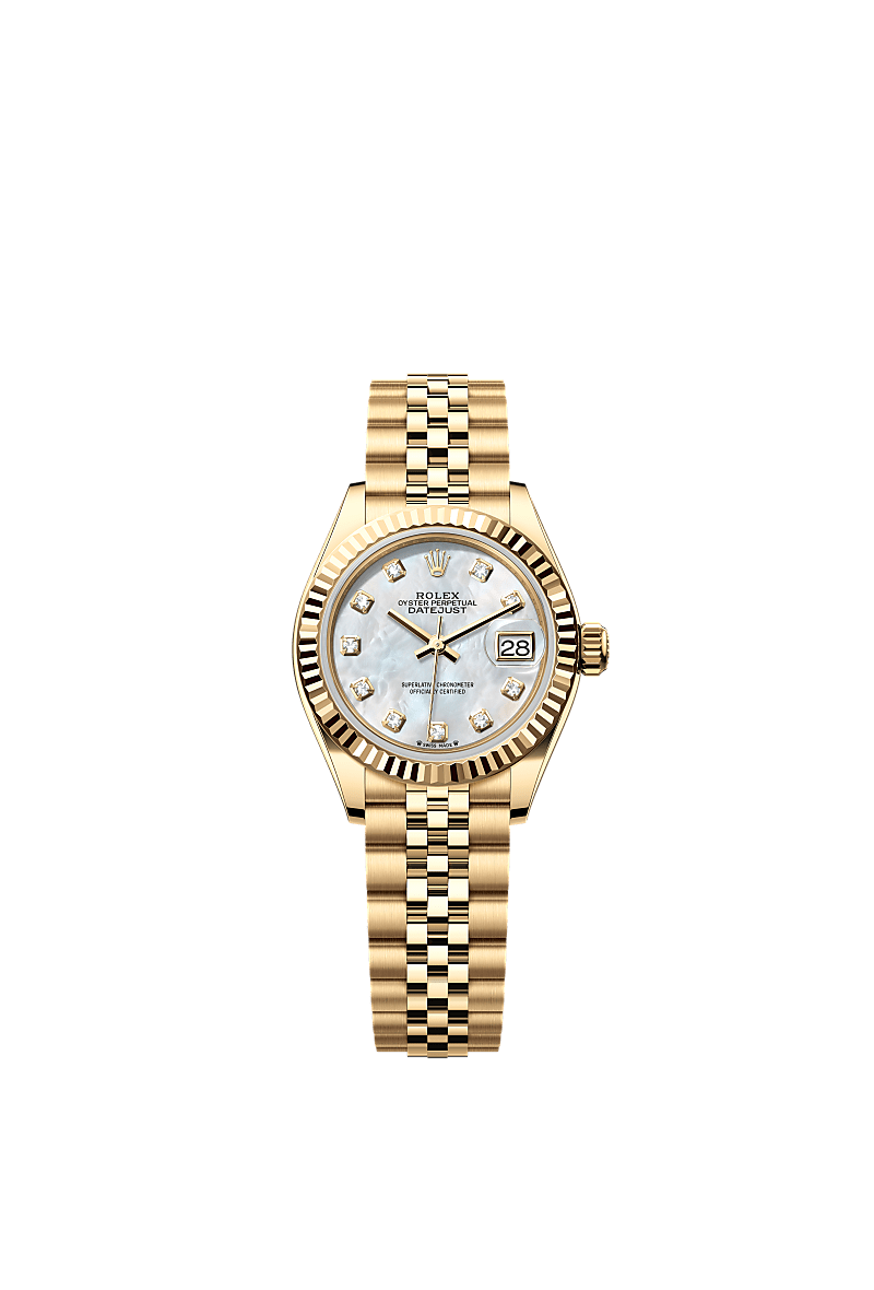 蚝式恒动女装日志型腕表18K黄金款,搭配镶钻白色珍珠母表盘及纪念型(Jubilee)表带。