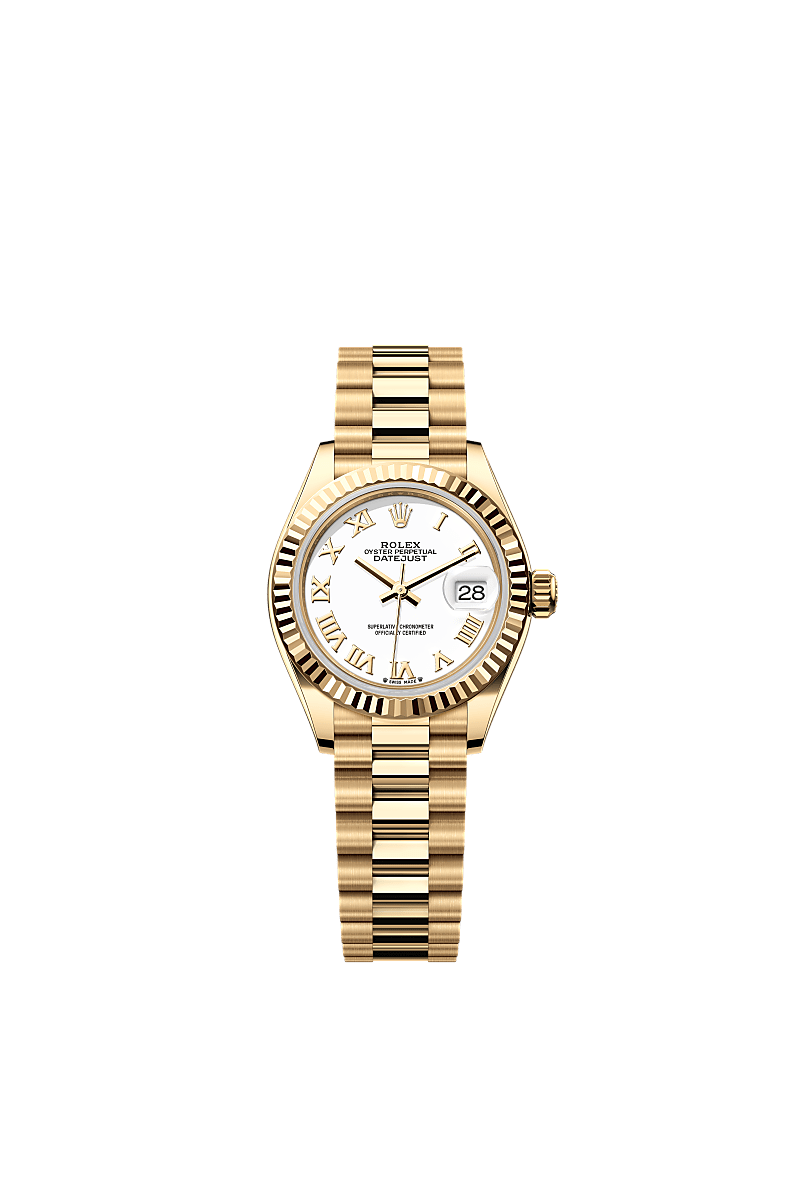 女装日志型搭配显赫尊贵的元首型(President)表带。外圈底下的隐蔽连接组件,确保表带和表壳之间达到无缝连接的视觉效果,使纯金或铂金表带如虎添翼。