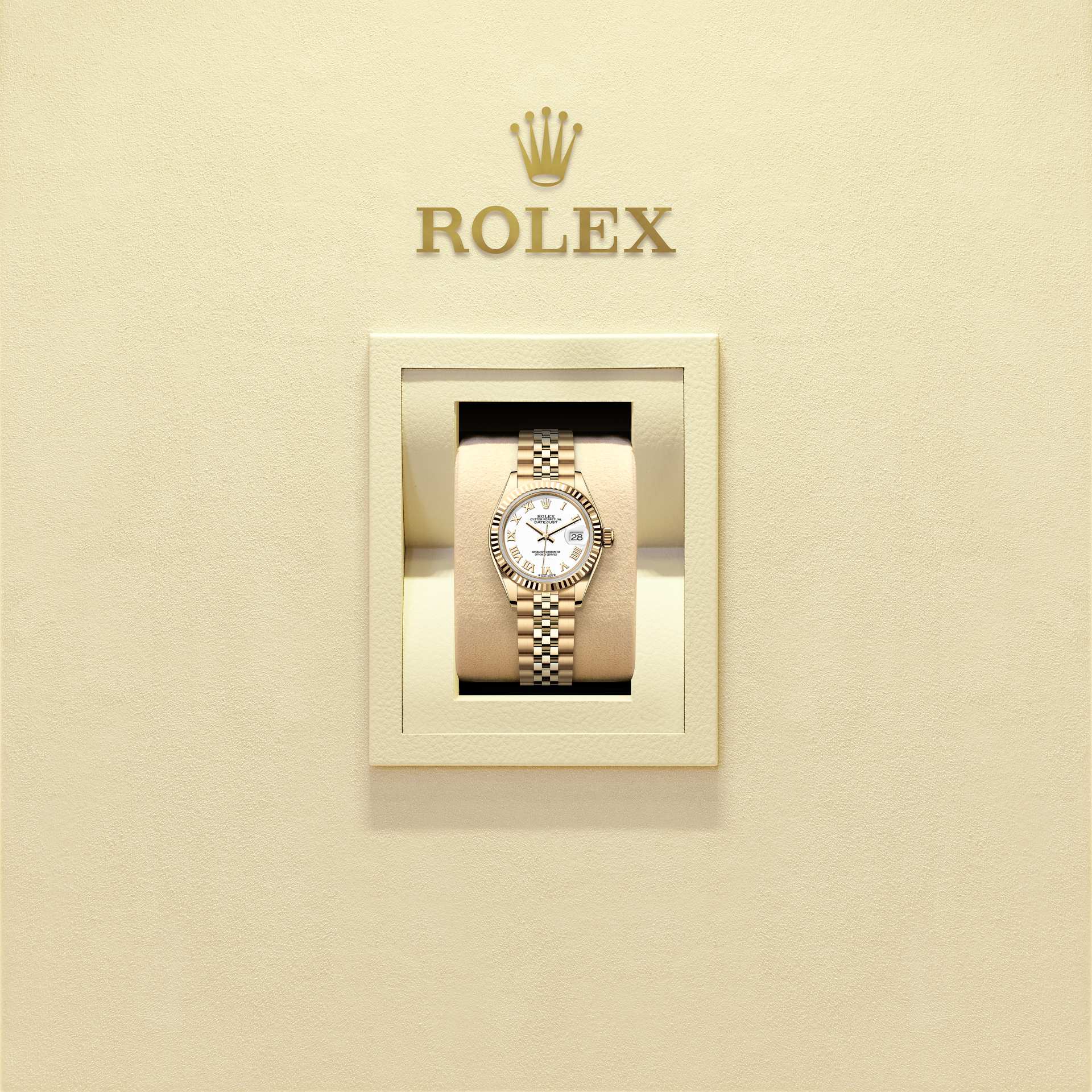 而底盖上可见的坑纹设计亦出于同样目的,并以特定的劳力士工具旋紧于表壳。及后,三角坑纹演变为一项美学设计元素,堪为劳力士的经典特色。时至今日,三角坑纹成为品牌腕表的特色,这款女装日志型的外圈以金制成。