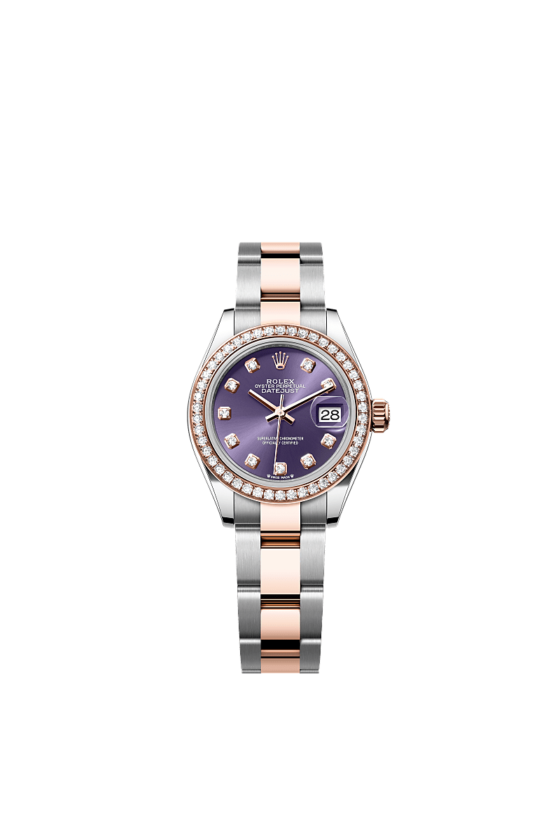 蚝式恒动女装日志型腕表永恒玫瑰金及蚝式钢款,搭配镶钻茄紫色表盘及蚝式(Oyster)表带。