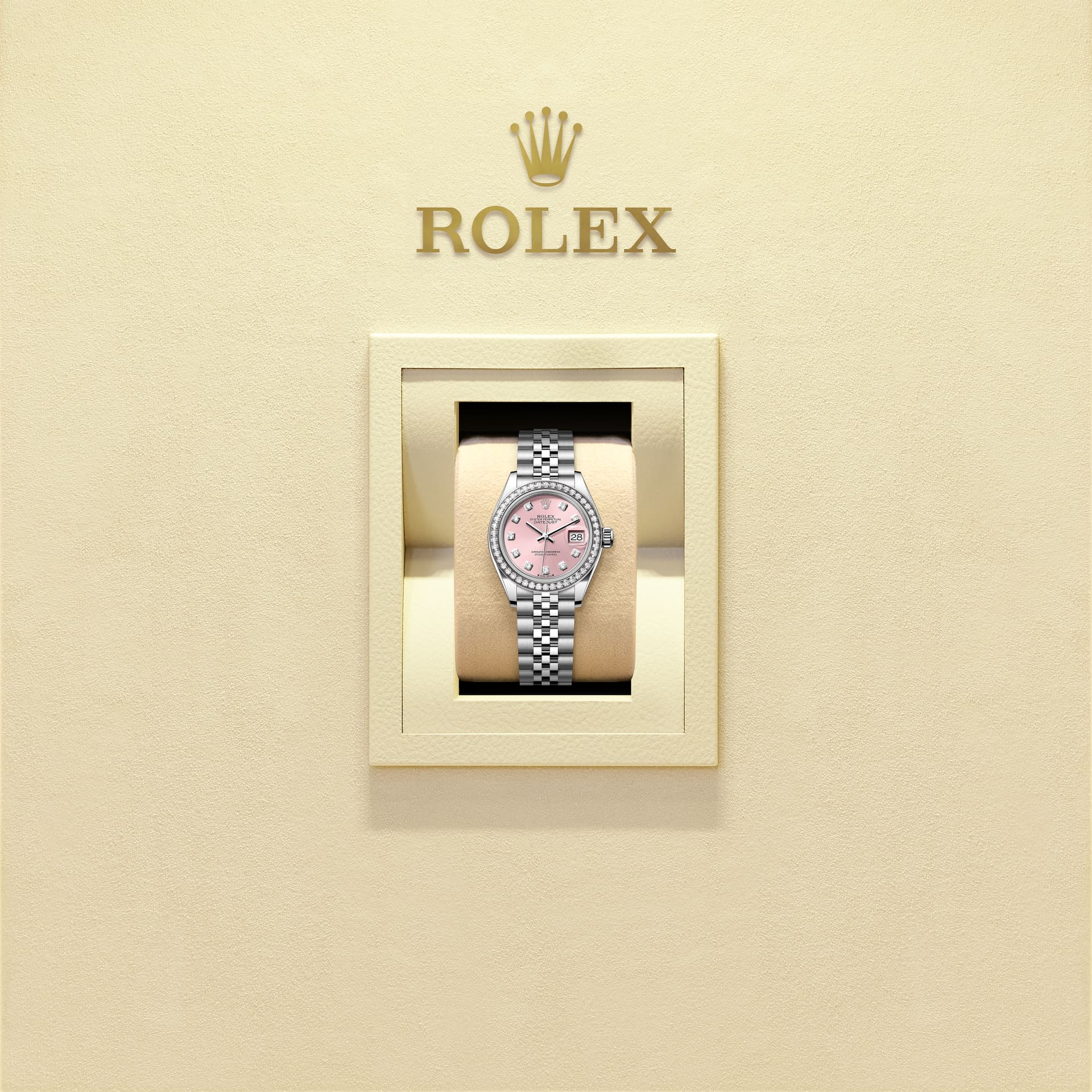 表盘设有18K金底座镶托钻石。蚝式系列的许多表盘款式均采用太阳光线效果,折射出淡雅光泽。这种效果需要超卓的刷光技术,打造从表盘中央往外扩展的刻纹。