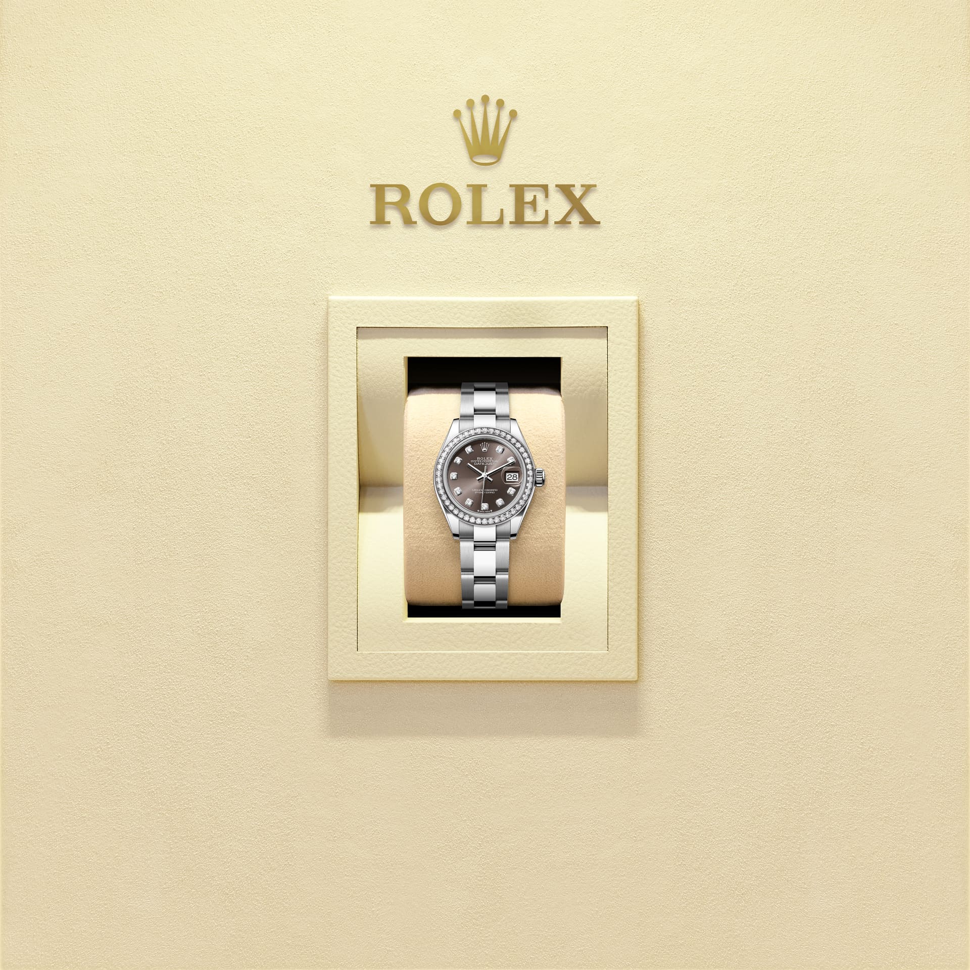 蚝式恒动女装日志型腕表白色黄金及蚝式钢款,搭配镶钻深灰色表盘及蚝式(Oyster)表带。