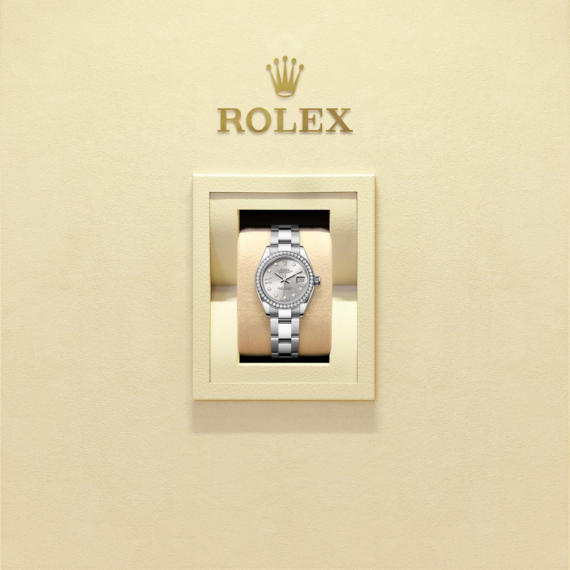 表盘设有18K金底座镶托钻石及镶8颗钻石的18K金罗马数字IX。蚝式系列的许多表盘款式均采用太阳光线效果,折射出淡雅光泽。这种效果需要超卓的刷光技术,打造从表盘中央往外扩展的刻纹。