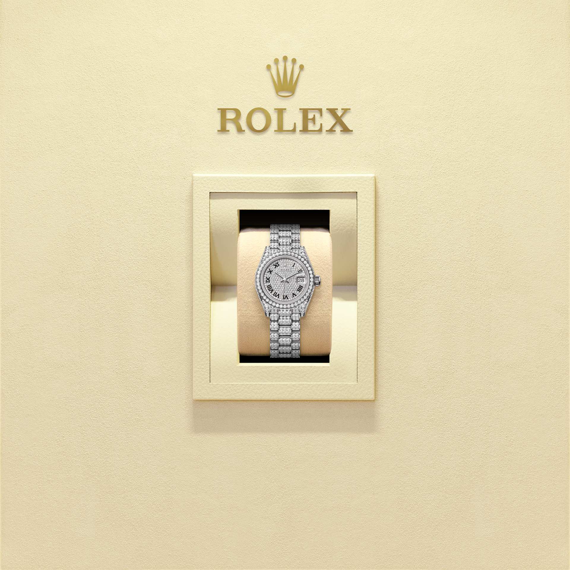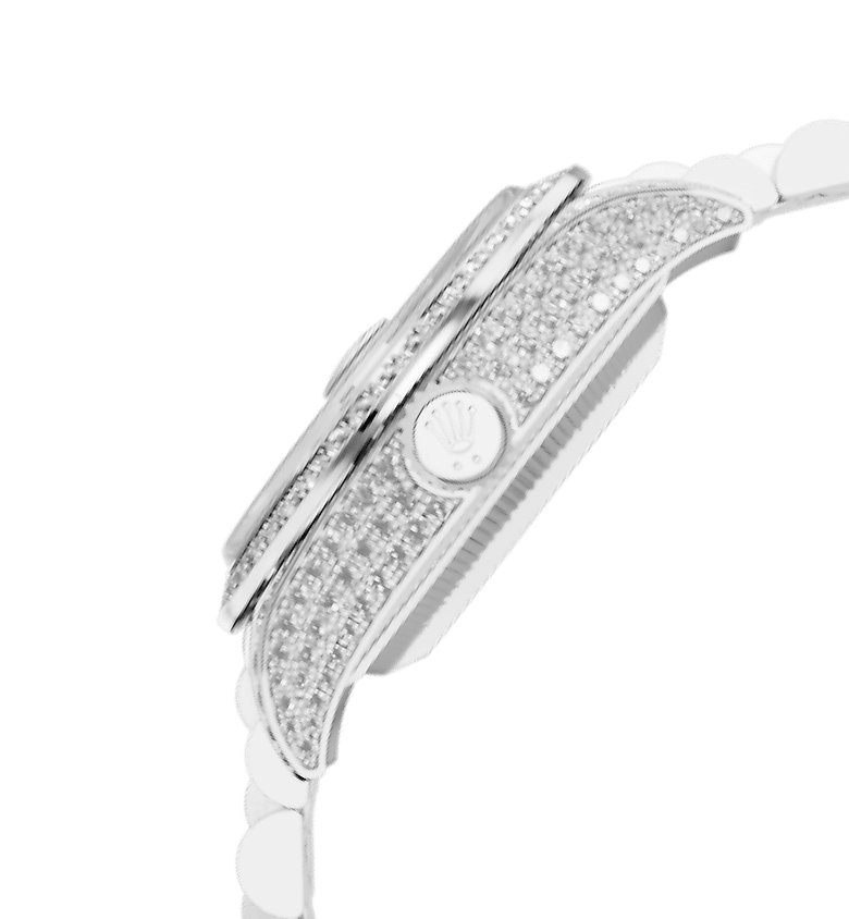 女装日志型搭配显赫尊贵的元首型(President)表带。外圈底下的隐蔽连接组件,确保表带和表壳之间达到无缝连接的视觉效果,使纯金或铂金表带如虎添翼。