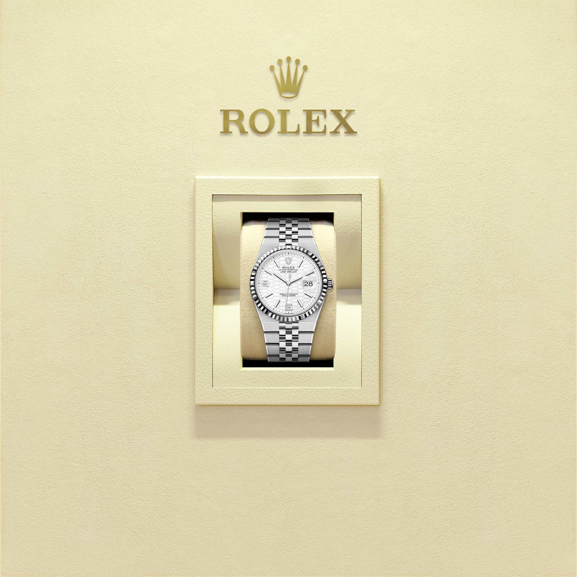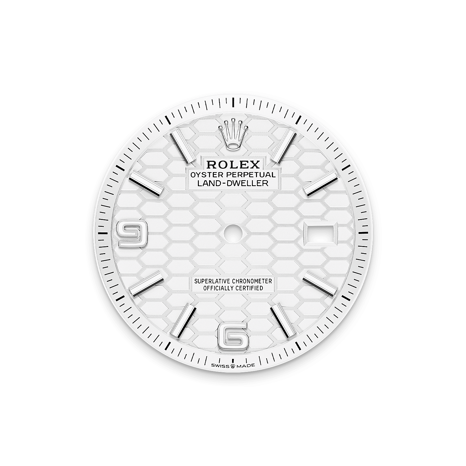 此表盘饰以蜂巢图案及磨砂修饰。表盘制作结合现代高科技与传统工艺,完全由劳力士自主研创。