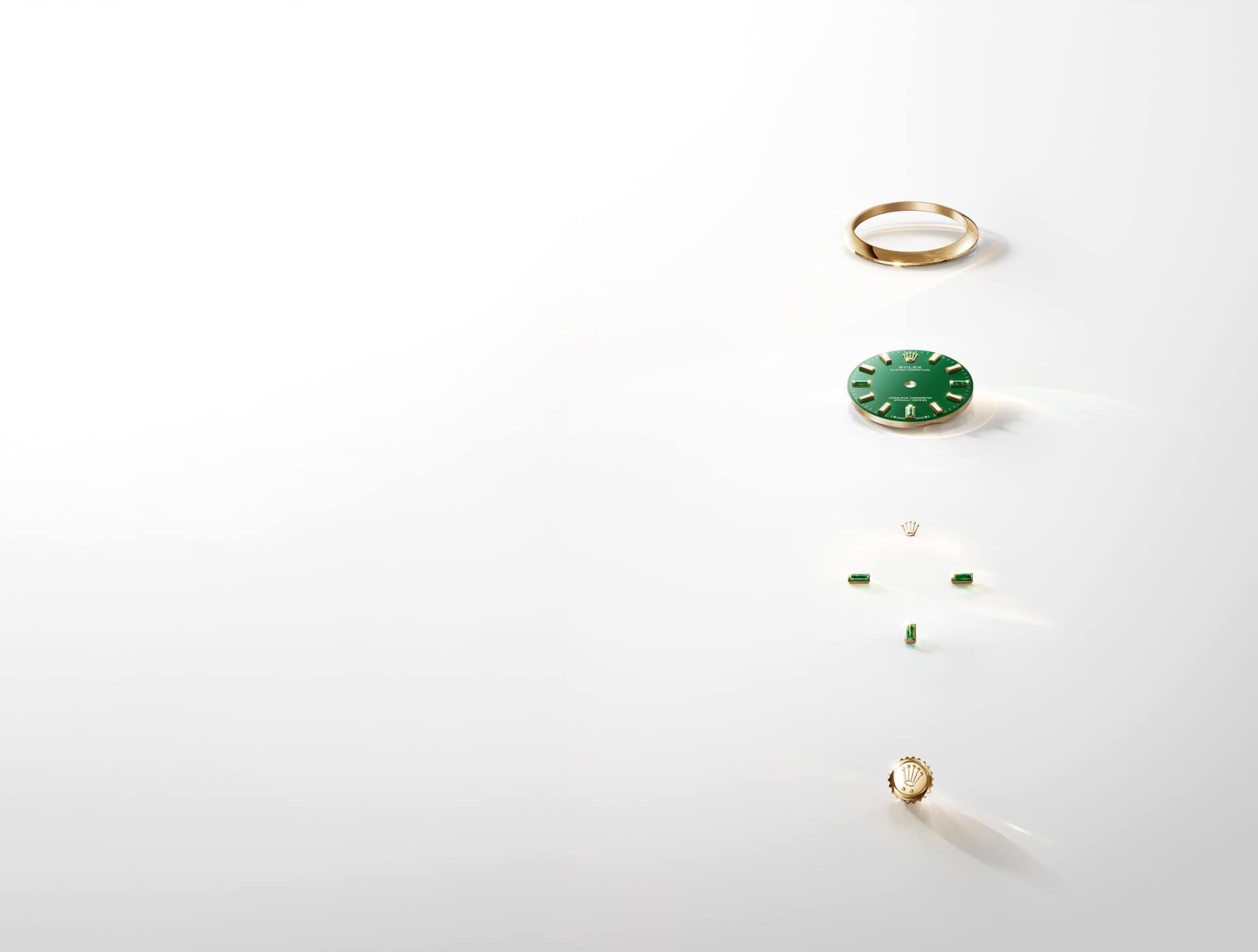 蚝式恒动型 28腕表以18K黄金制成,搭配绿石漆面表盘;蚝式恒动型 34腕表以18K永恒玫瑰金制成,搭配蓝石漆面表盘。3、6、9点钟位置的钟点标记以天然宝石制成,此为劳力士蚝式恒动型腕表的首创之举。