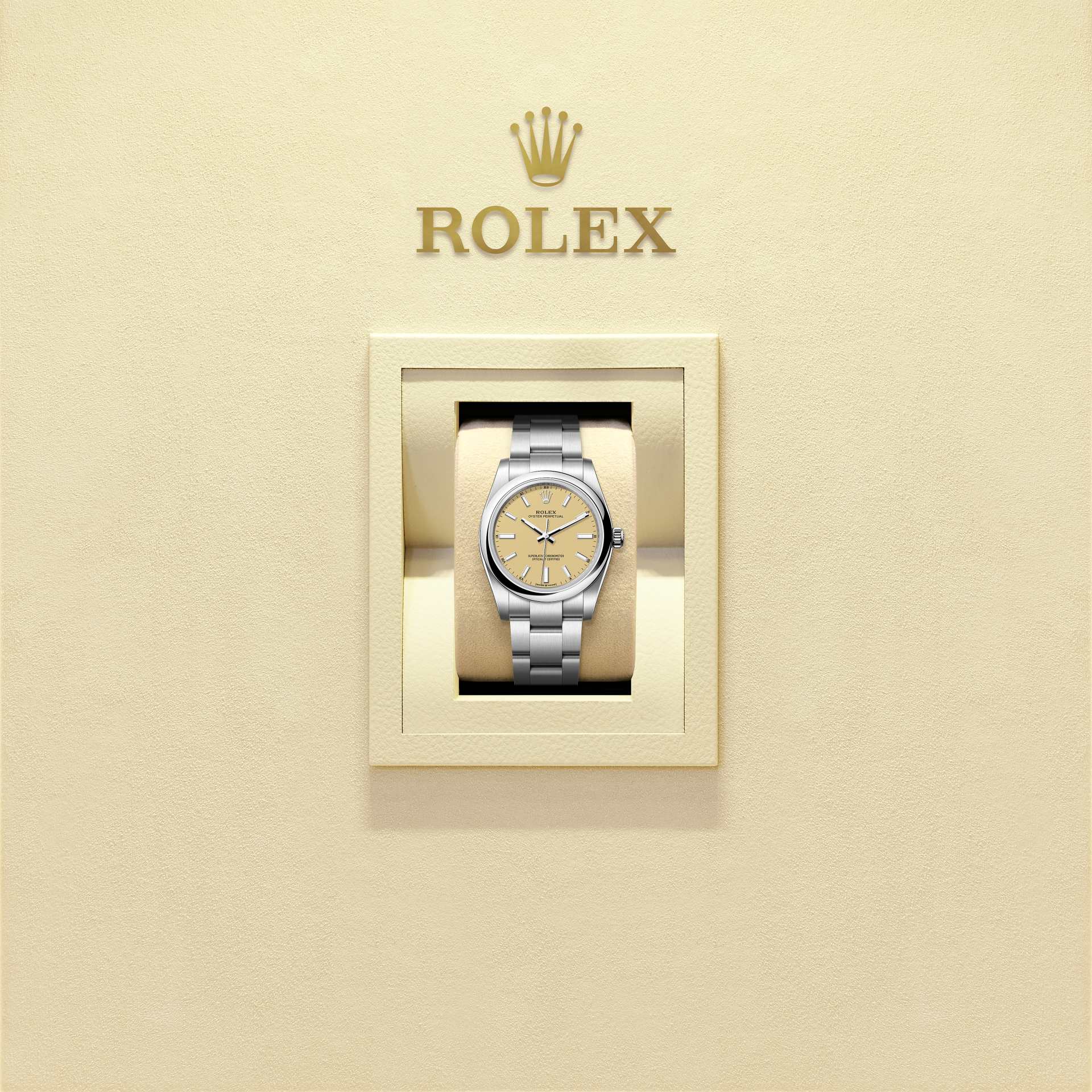 蚝式恒动型 34腕表搭配米色表盘及蚝式(Oyster)表带。
