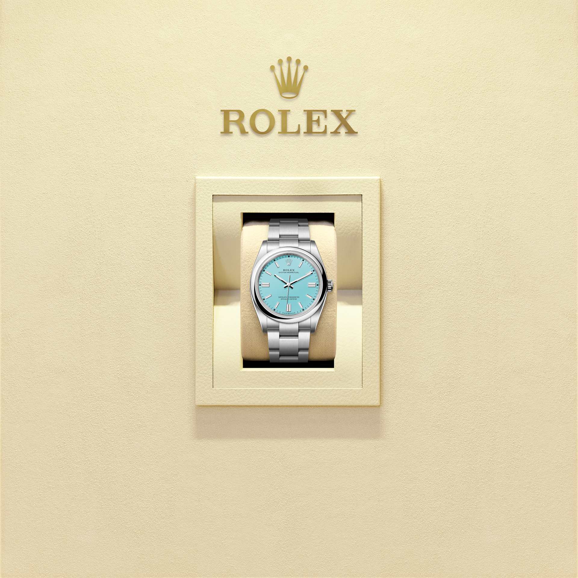 蚝式恒动型 36腕表搭配绿松石蓝色表盘及蚝式(Oyster)表带。