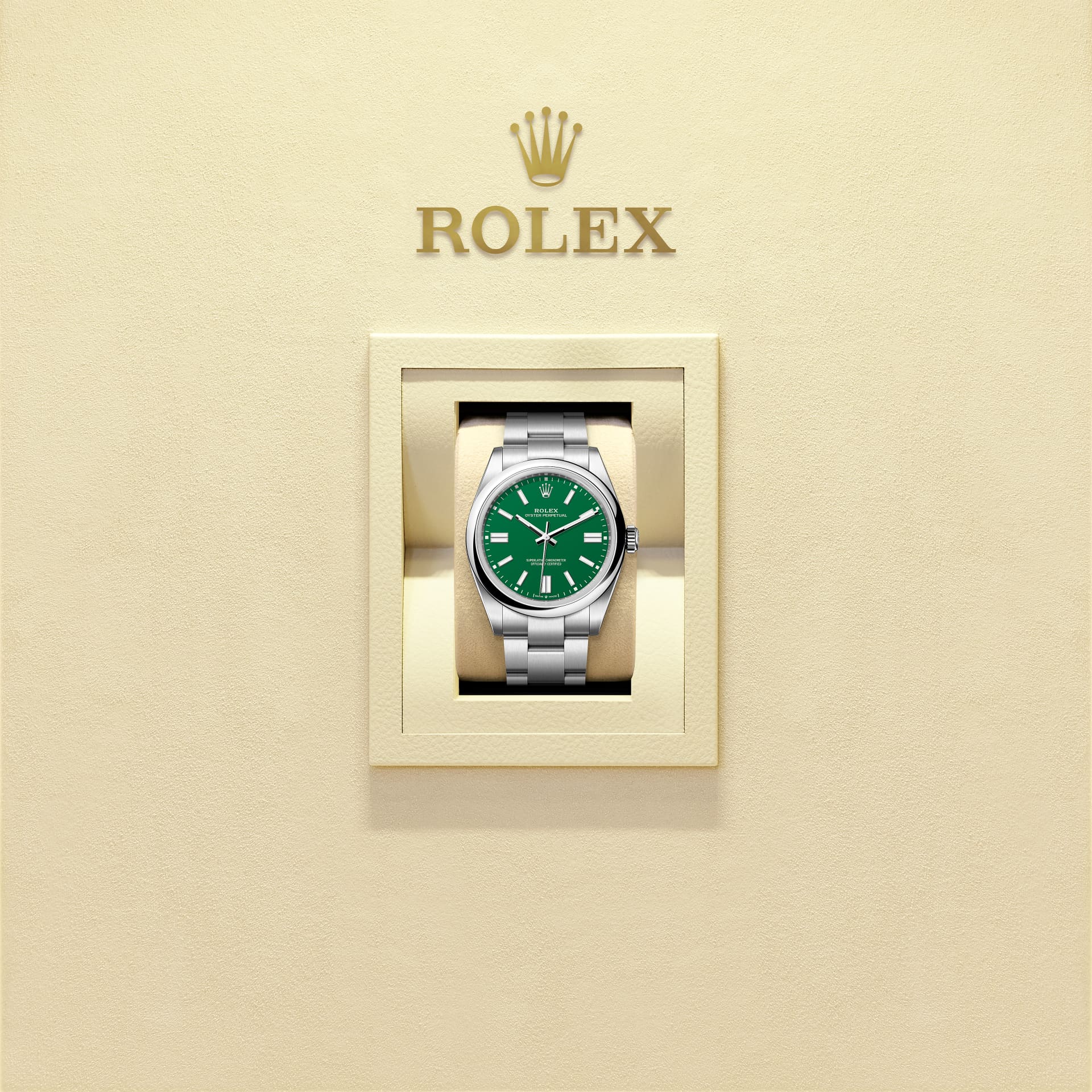 蚝式恒动型 41腕表搭配绿色表盘及蚝式(Oyster)表带。