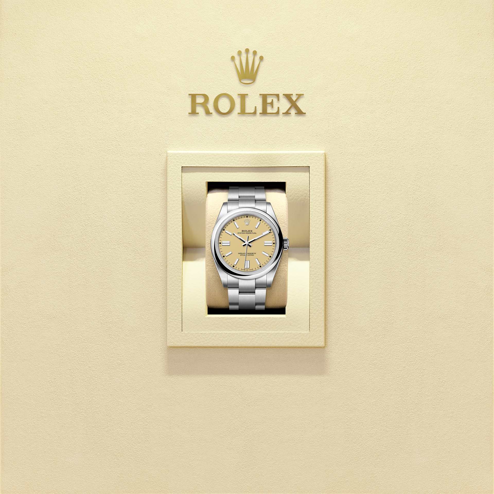 蚝式恒动型 41腕表搭配米色表盘及蚝式(Oyster)表带。